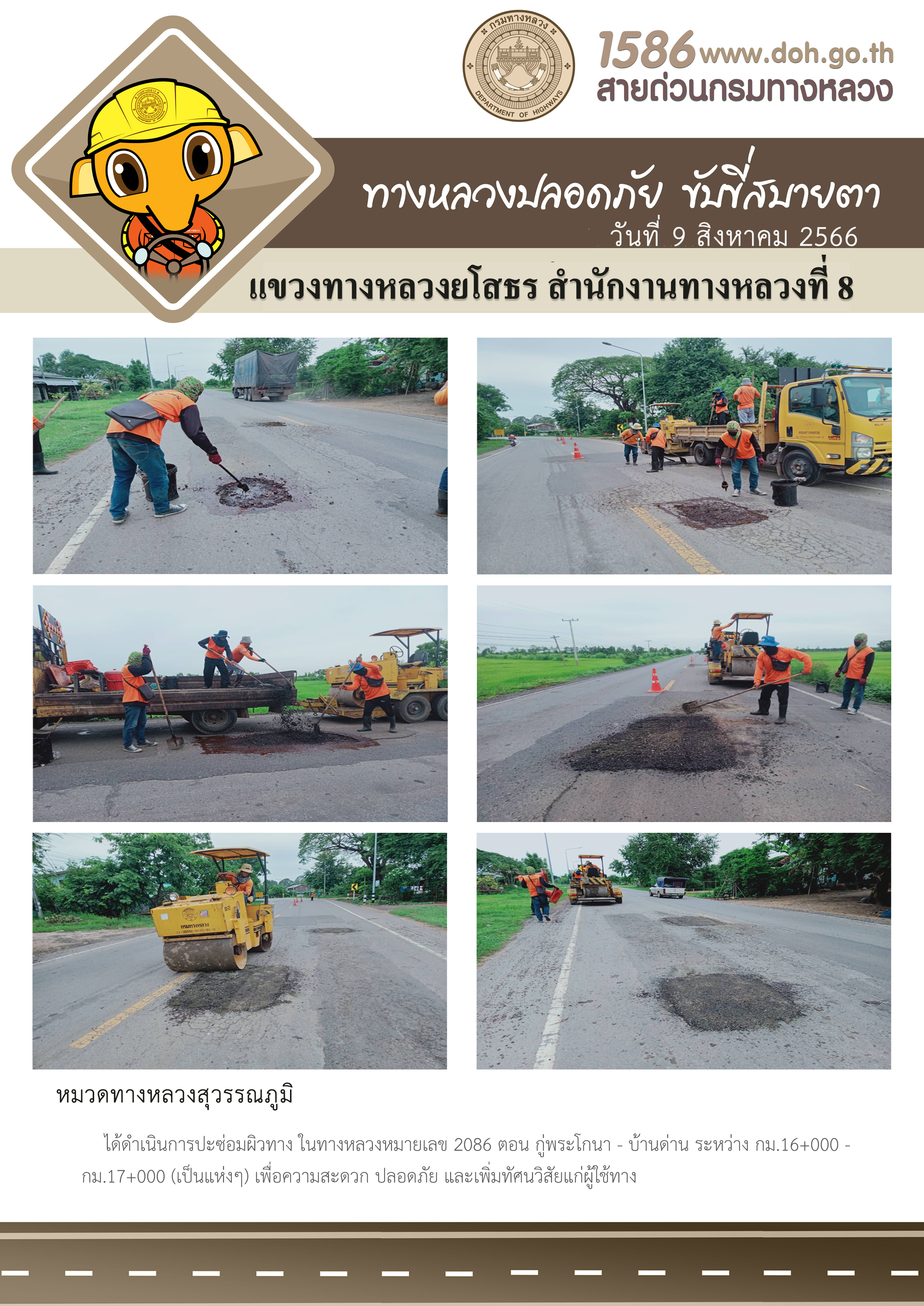 วันที่ 9 สิงหาคม 2566 หมวดทางหลวงสุวรรณภูมิ ได้ดำเนินการปะซ่อมผิวทาง ในทางหลวงหมายเลข 2086 ตอน กู่พระโกนา - บ้านด่าน ระหว่าง กม.16+000 - กม.17+000 (เป็นแห่งๆ) เพื่อความสะดวก ปลอดภัย และเพิ่มทัศนวิสัยแก่ผู้ใช้ทาง