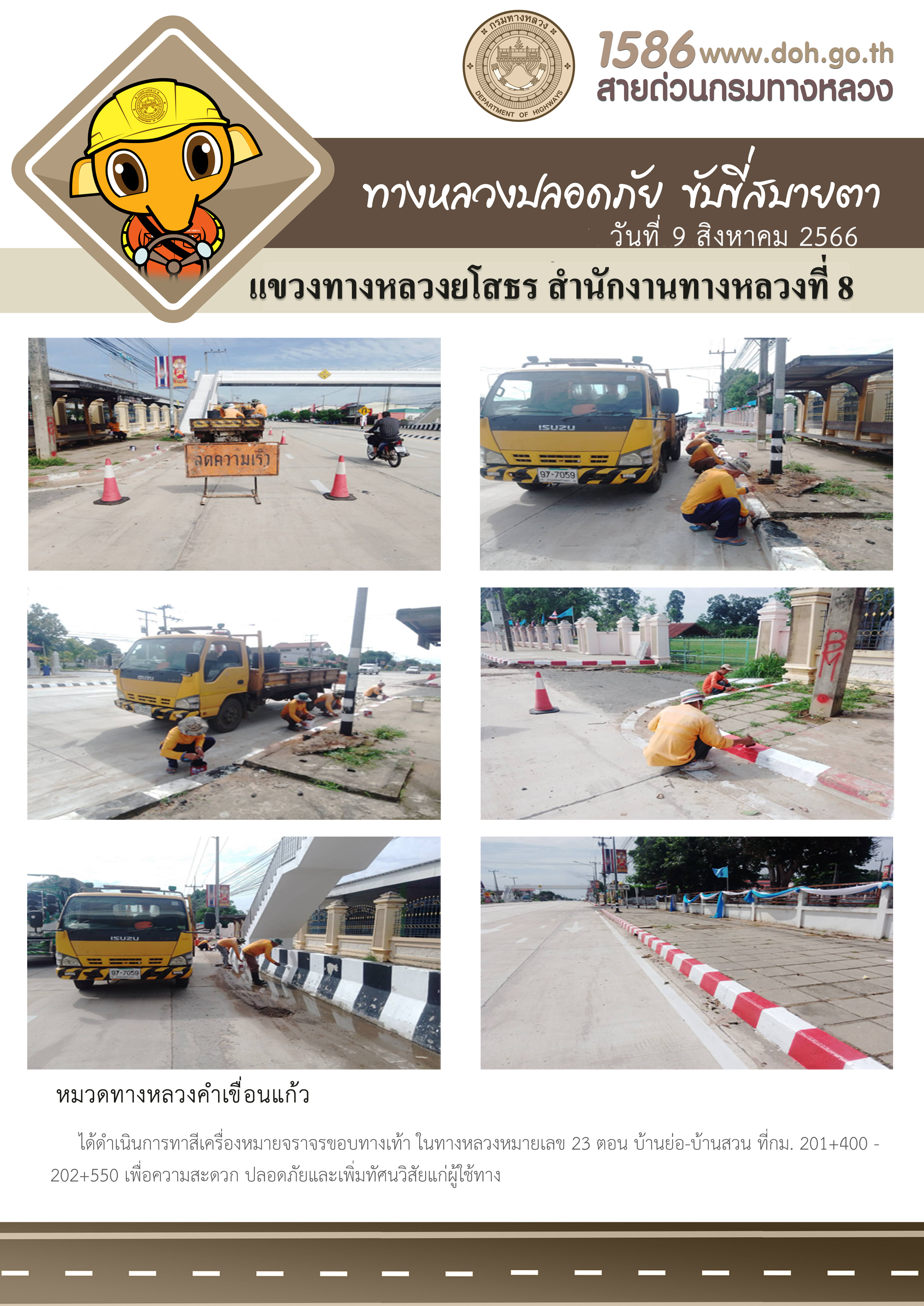 วันที่ 9 สิงหาคม 2566 หมวดทางหลวงคำเขื่อนแก้ว ได้ดำเนินการทาสีเครื่องหมายจราจรขอบทางเท้า ในทางหลวงหมายเลข 23 ตอน บ้านย่อ - บ้านสวน ที่ กม.201+400 - กม.202+550 เพื่อความสะดวก ปลอดภัยและเพิ่มทัศนวิสัยแก่ผู้ใช้ทาง