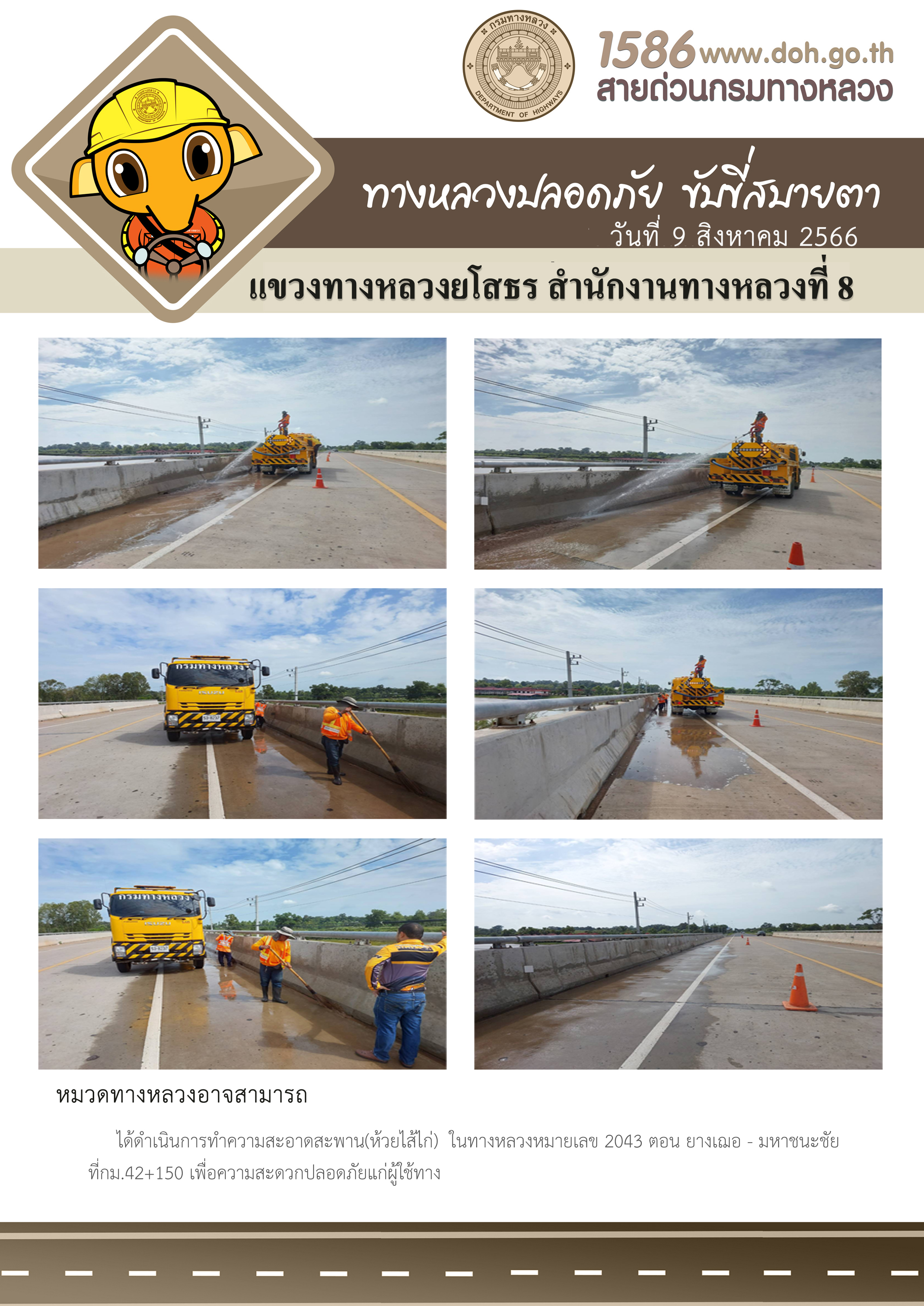 วันที่ 9 สิงหาคม 2566 หมวดทางหลวงอาจสามารถ ได้ดำเนินการทำความสะอาดสะพาน(ห้วยไส้ไก่) ในทางหลวงหมายเลข 2043 ตอน ยางเฌอ - มหาชนะชัย ที่ กม.42+150 เพื่อความสะดวกปลอดภัยแก่ผู้ใช้ทาง