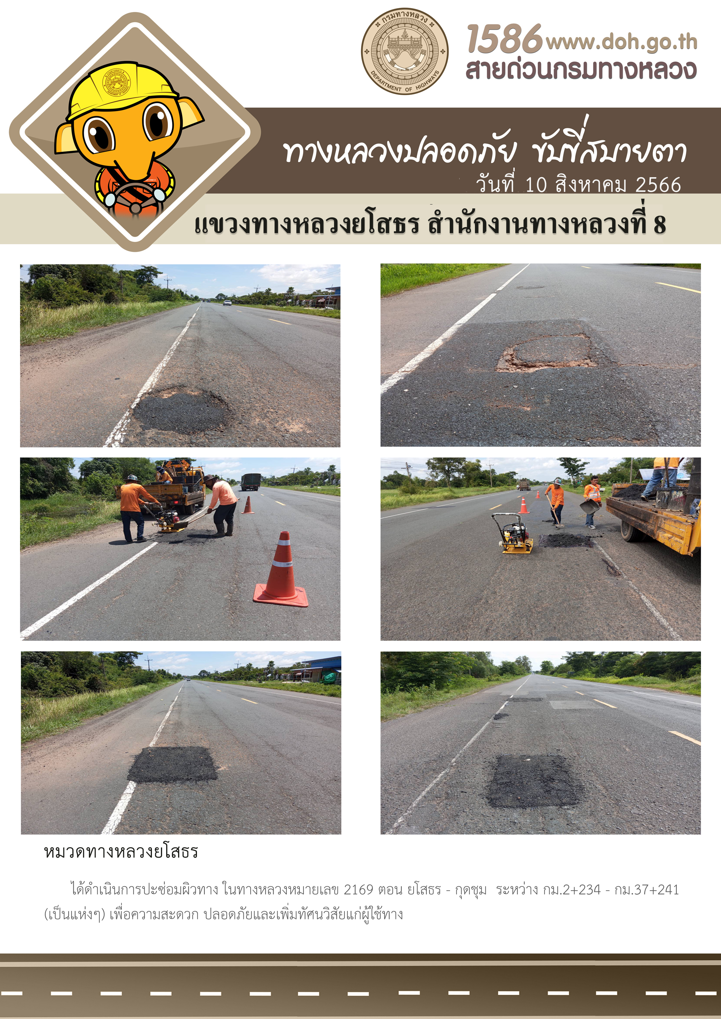 วันที่ 10 สิงหาคม 2566 หมวดทางหลวงยโสธร ได้ดำเนินการปะซ่อมผิวทาง ในทางหลวงหมายเลข 2169 ตอน ยโสธร - กุดชุม ระหว่าง กม.2+234 - กม.37+241 (เป็นแห่งๆ) เพื่อความสะดวก ปลอดภัยและเพิ่มทัศนวิสัยแก่ผู้ใช้ทาง