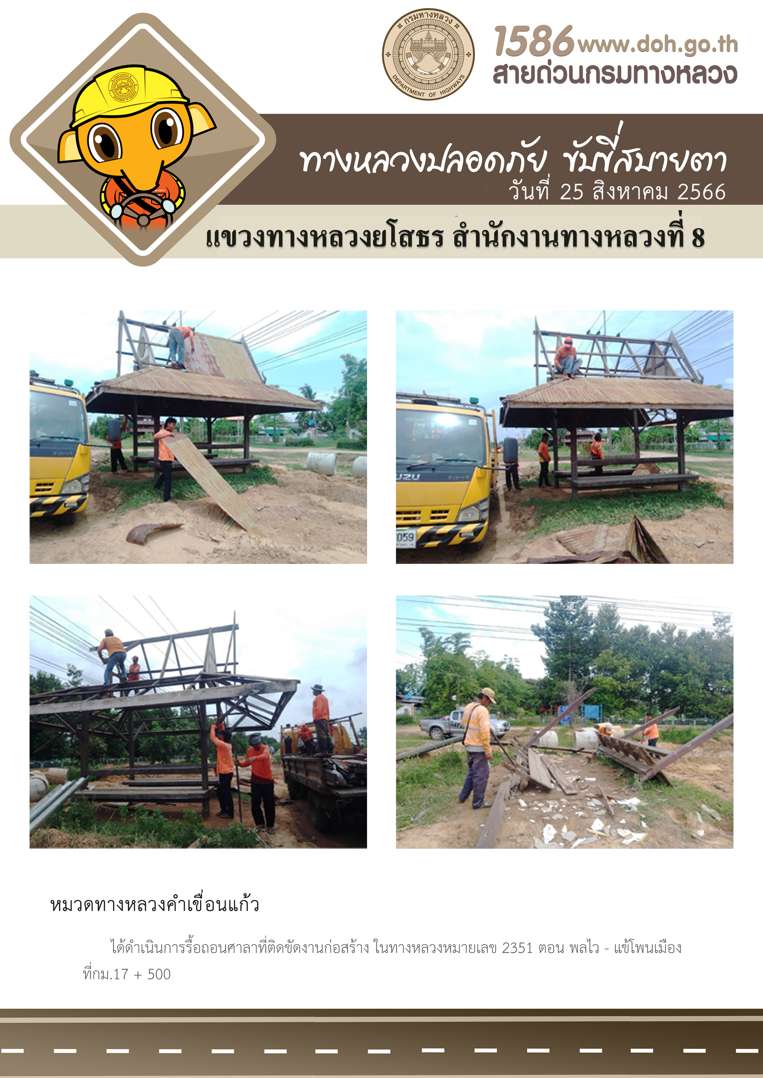 วันที่ 25 สิงหาคม 2566 หมวดทางหลวงคำเขื่อนแก้ว ได้ดำเนินการรื้อถอนศาลาที่ติดขัดงานก่อสร้าง ในทางหลวงหมายเลข 2351 ตอน พลไว - แข้โพนเมือง ที่ กม.17+ 500