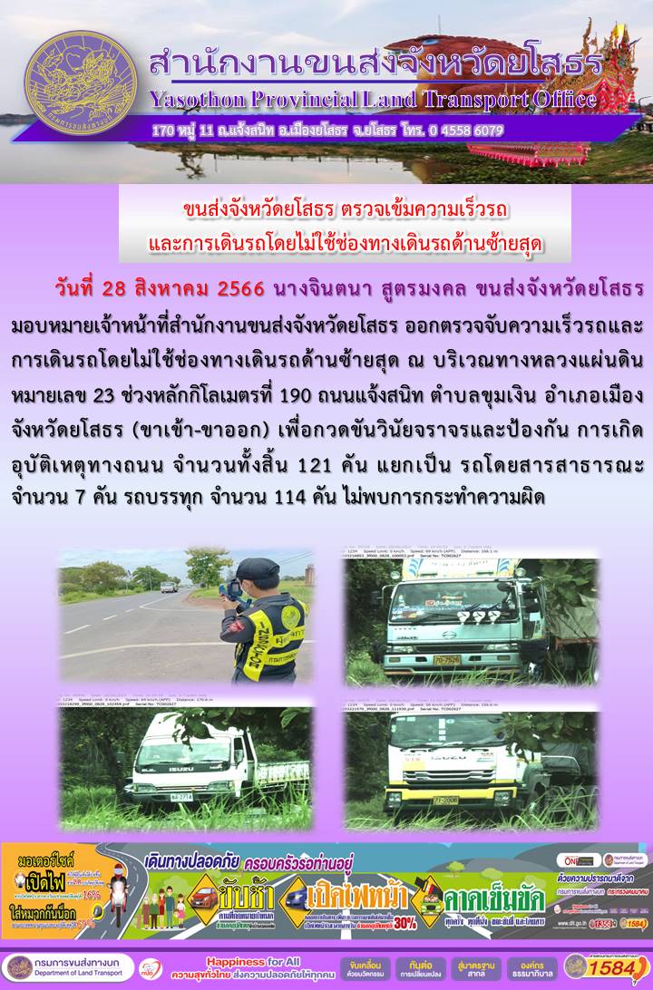 วันที่ 28 สิงหาคม 2566 เจ้าหน้าที่สำนักงานขนส่งจังหวัดยโสธร ออกตั้งจุดตรวจจับความเร็ว