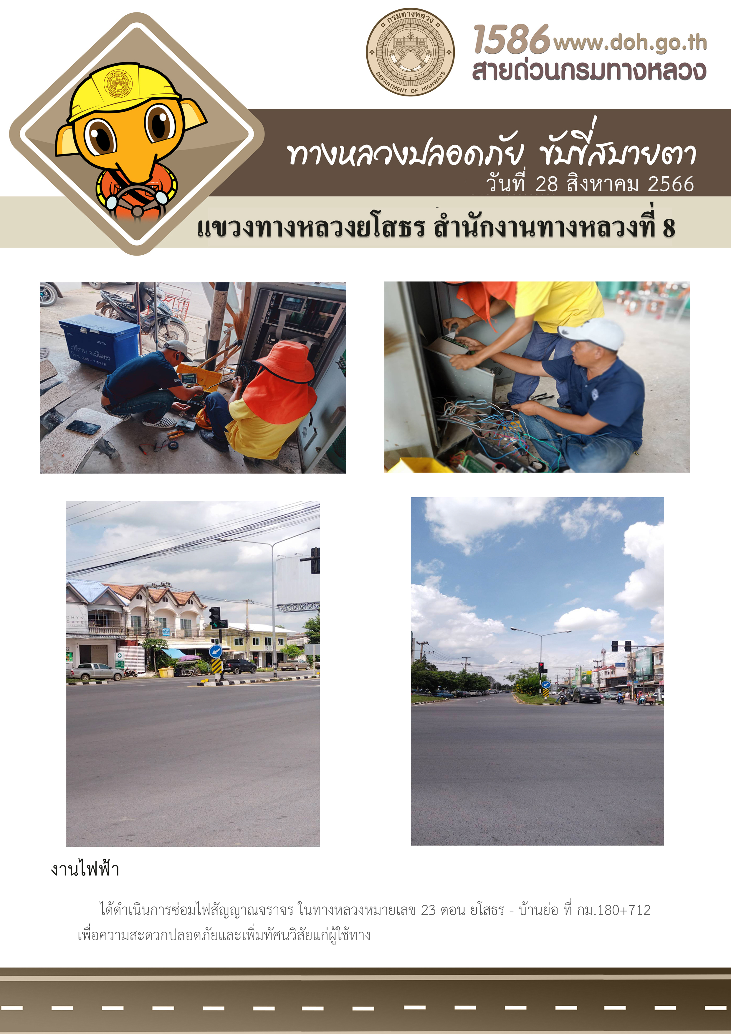 วันที่ 28 สิงหาคม 2566 งานไฟฟ้า ได้ดำเนินการซ่อมไฟสัญญาณจราจร ในทางหลวงหมายเลข 23 ตอน ยโสธร - บ้านย่อ ที่ กม.180+712 เพื่อความสะดวกปลอดภัยและเพิ่มทัศนวิสัยแก่ผู้ใช้ทาง