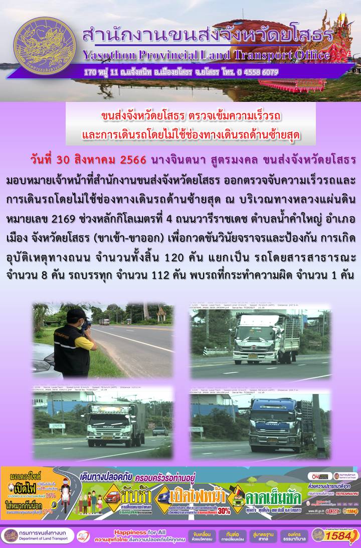 วันที่ 30 สิงหาคม 2566 เจ้าหน้าที่สำนักงานขนส่งจังหวัดยโสธร ออกตั้งจุดตรวจจับความเร็ว