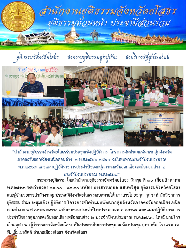 สำนักงานยุติธรรมจังหวัดยโสธรร่วมประชุมเชิงปฏิบัติการ โครงการจัดทำแผนพัฒนากลุ่มจังหวัดภาคตะวันออกเฉียงเหนือตอนล่าง 2 พ.ศ.2566-2570 ฉบับทบทวนประจำปีงบประมาณพ.ศ.2568 และแผนปฏิบัติราชการประจำปีของกลุ่มภาคตะวันออกเฉียงเหนือตอนล่าง 2 ประจำปีงบประมาณ พ.ศ.2