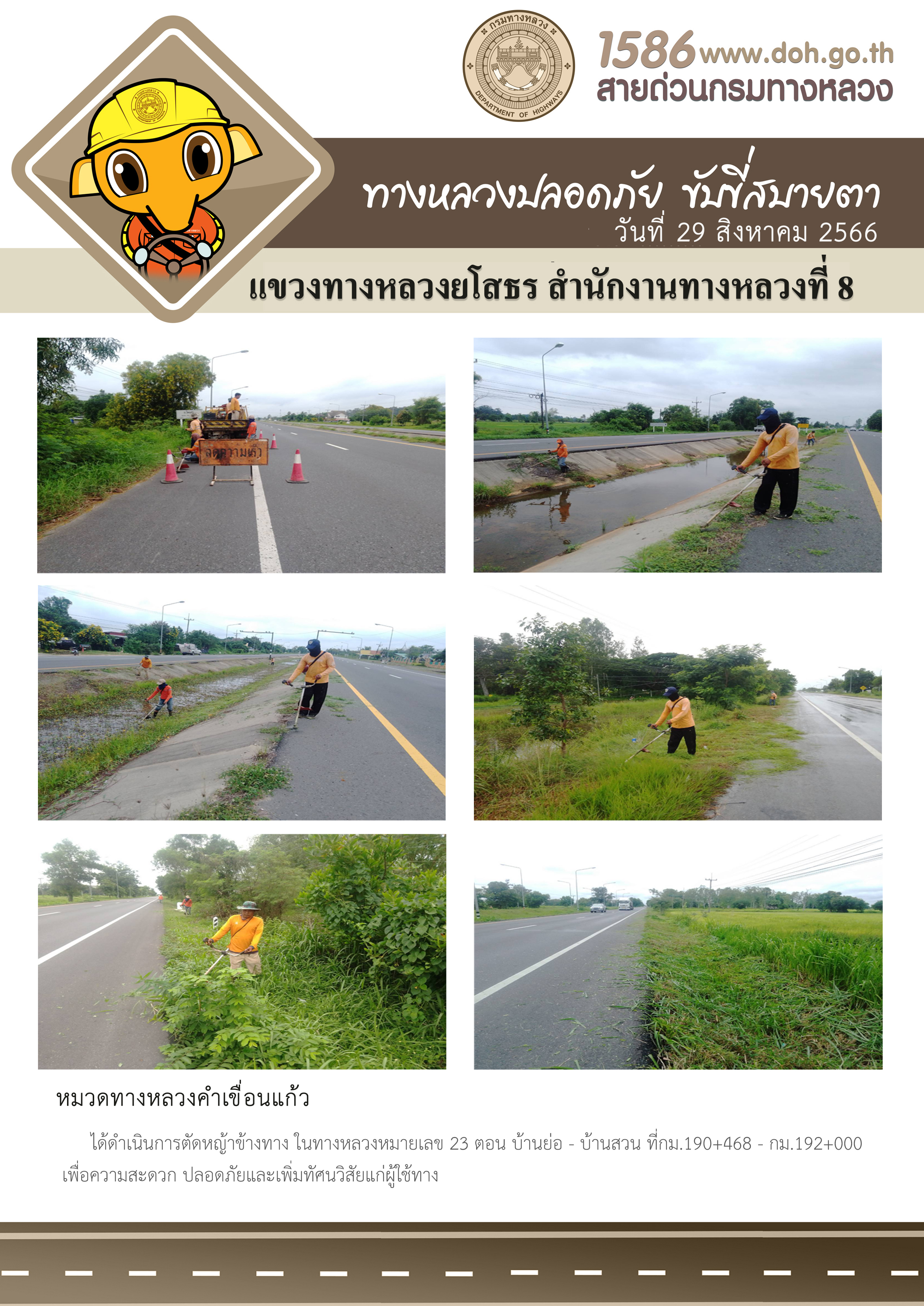 วันที่ 29 สิงหาคม 2566 หมวดทางหลวงคำเขื่อนแก้ว ได้ดำเนินการตัดหญ้าข้างทาง ในทางหลวงหมายเลข 23 ตอน บ้านย่อ - บ้านสวน ที่กม.190+468 - กม.192+000 เพื่อความสะดวก ปลอดภัยและเพิ่มทัศนวิสัยแก่ผู้ใช้ทาง