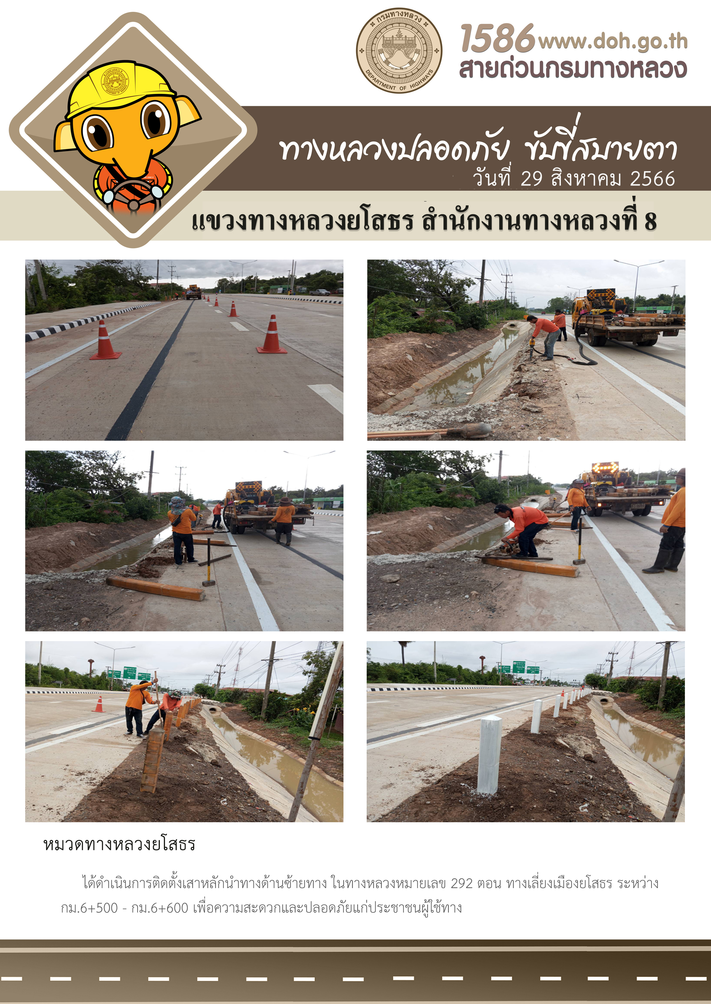 วันที่ 29 สิงหาคม 2566 หมวดทางหลวงยโสธร ได้ดำเนินการติดตั้งเสาหลักนำทางด้านซ้ายทาง ในทางหลวงหมายเลข 292 ตอน ทางเลี่ยงเมืองยโสธร ระหว่าง กม.6+500 - กม.6+600 เพื่อความสะดวกและปลอดภัยแก่ประชาชนผู้ใช้ทาง