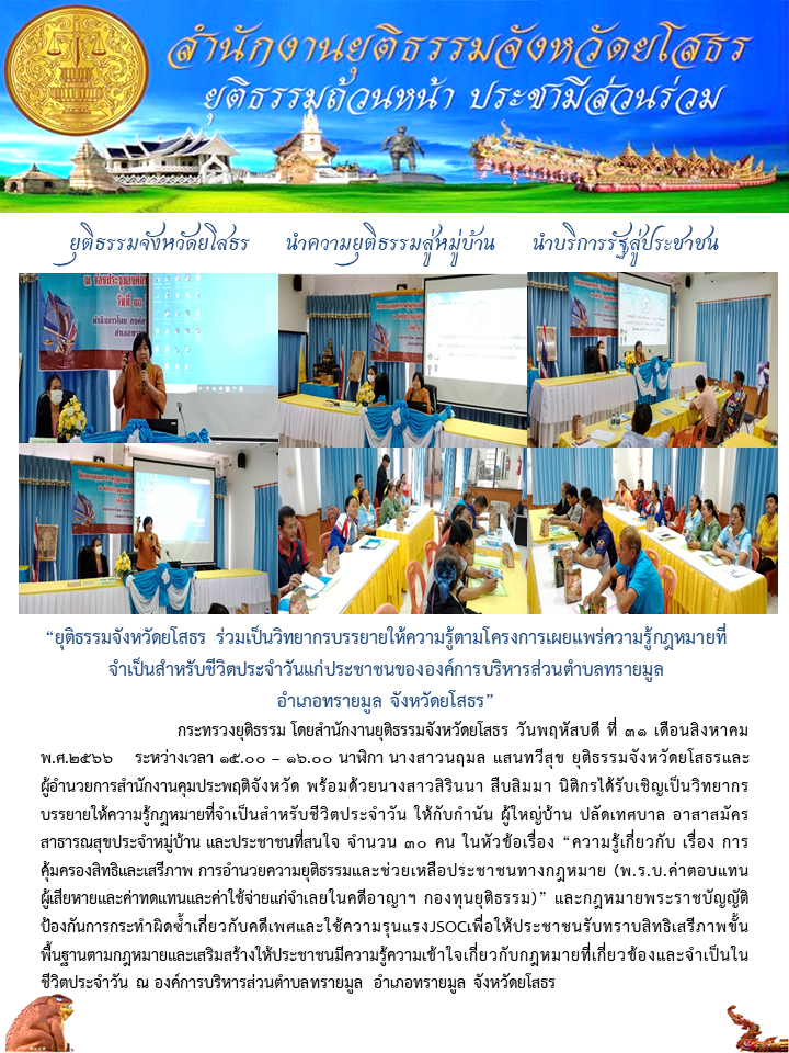 ยุติธรรมจังหวัดยโสธร ร่วมเป็นวิทยากรบรรยายให้ความรู้ตามโครงการเผยแพร่ความรู้กฎหมายที่จำเป็นสำหรับชีวิตประจำวันแก่ประชาชนขององค์การบริหารส่วนตำบลทรายมูล อำเภอทรายมูล จังหวัดยโสธร