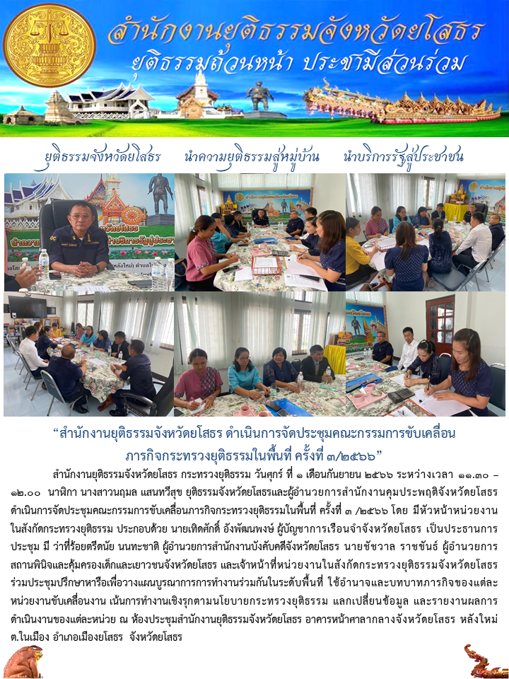 สำนักงานยุติธรรมจังหวัดยโสธร ดำเนินการจัดประชุมคณะกรรมการขับเคลื่อนภารกิจกระทรวงยุติธรรมในพื้นที่ ครั้งที่ 3/2566
