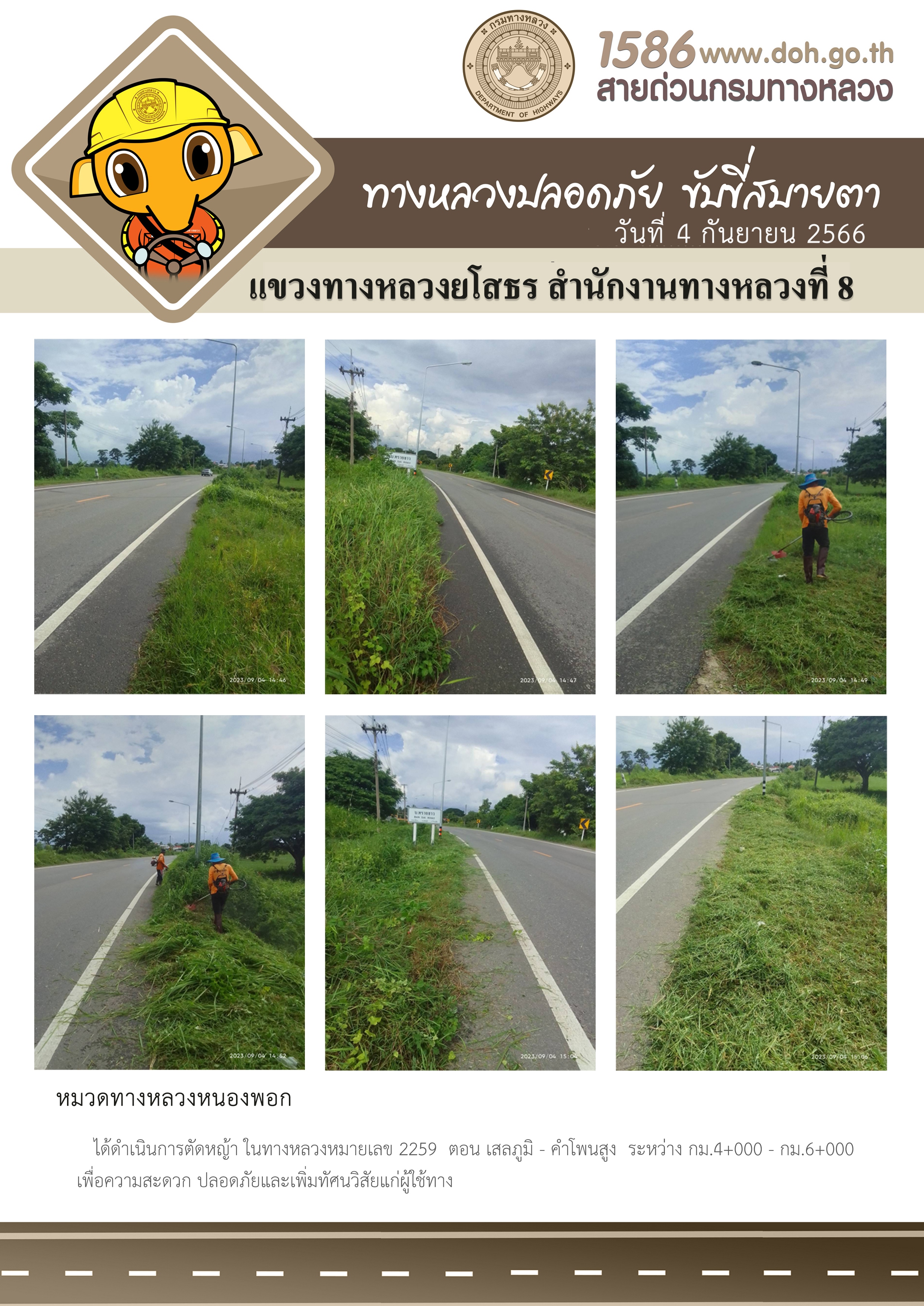 วันที่ 4 กันยายน 2566 หมวดทางหลวงหนองพอก ได้ดำเนินการตัดหญ้า ในทางหลวงหมายเลข 2259 ตอน เสลภูมิ - คำโพนสูง ระหว่าง กม.4+000 - กม.6+000 เพื่อความสะดวก ปลอดภัยและเพิ่มทัศนวิสัยแก่ผู้ใช้ทาง