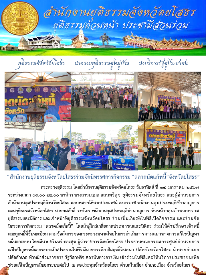 วันที่ 15 ม.ค. 2567 (13:20 น.)กระทรวงยุติธรรม โดยสำนักงานยุติธรรมจังหวัดยโสธร วันอาทิตย์ ที่ ๑๔ มกราคม ๒๕๖๗ระหว่างเวลา ๐๙.๐๐-๑๒.๐๐ นาฬิกา นางสาวนฤมล แสนทวีสุข ยุติธรรมจังหวัดยโสธร และผู้อำนวยการสำนักงานคุมประพฤติจังหวัดยโสธร มอบหมายให้นายประเวศน์ ละครราช พนักงานคุมประพฤติชำนาญการ แทนยุติธรรมจังหวัดยโสธร นายคมศักดิ์ วงษ์ไกร พนักงานคุมประพฤติขำนาญการ หัวหน้ากลุ่มอำนวยความยุติธรรมและนิติการ และเจ้าหน้าที่ยุติธรรมจังหวัดยโสธร ร่วมเป็นเกียรติในพิธีเปิดกิจกรรม และร่วมจัดนิทรรศการกิจกรรม “ตลาดนัดแก้หนี้” โดยนำผู้ไกล่เกลี่ยภาคประชาชนและนิติกร ร่วมให้คำปรึกษาเจ้าหนี้และลูกหนี้ที่ขึ้นทะเบียน ตามข้อสั่งการของกระทรวงมหาดไทยในการดำเนินการตามแนวทางการแก้ไขปัญหาหนี้นอกระบบ โดยมีนายชรินทร์ ทองสุข ผู้ว่าราชการจังหวัดยโสธร ประธานคณะกรรมการศูนย์อำนวยการแก้ไขปัญหาหนี้นอกระบบเป็นประธานในพิธี มีนายบรรลือ สัมฤทธิ์จินตนา ปลัดจังหวัดยโสธร นำนายอำเภอ ปลัดอำเภอ หัวหน้าส่วนราชการ รัฐวิสาหกิจ สถาบันทางการเงิน เข้าร่วมในพิธีและให้บริการประชาชนเพื่อช่วยแก้ไขปัญหาหนี้นอกระบบต่อไป ณ หอประชุมจังหวัดยโสธร ตำบลในเมือง อำเภอเมือง จังหวัดยโสธร