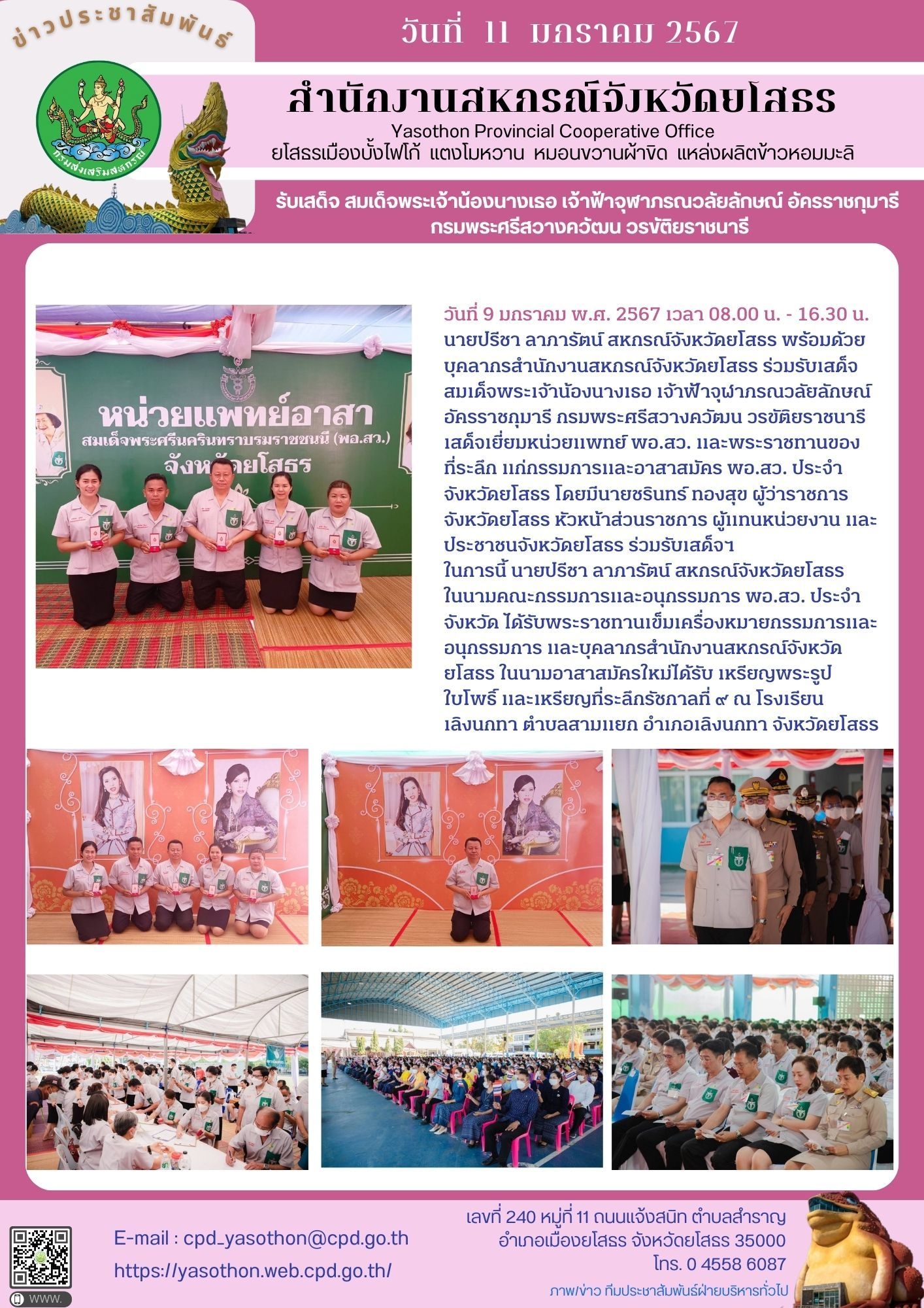 นายปรีชา ลาภารัตน์ สหกรณ์จังหวัดยโสธร พร้อมด้วยบุคลากรสำนักงานสหกรณ์จังหวัดยโสธร ร่วมรับเสด็จสมเด็จพระเจ้าน้องนางเธอ เจ้าฟ้าจุฬาภรณวลัยลักษณ์ อัครราชกุมารี กรมพระศรีสวางควัฒน วรขัติยราชนารี เสด็จเยี่ยมหน่วยแพทย์ พอ.สว. ณ โรงเรียนเลิงนกทา