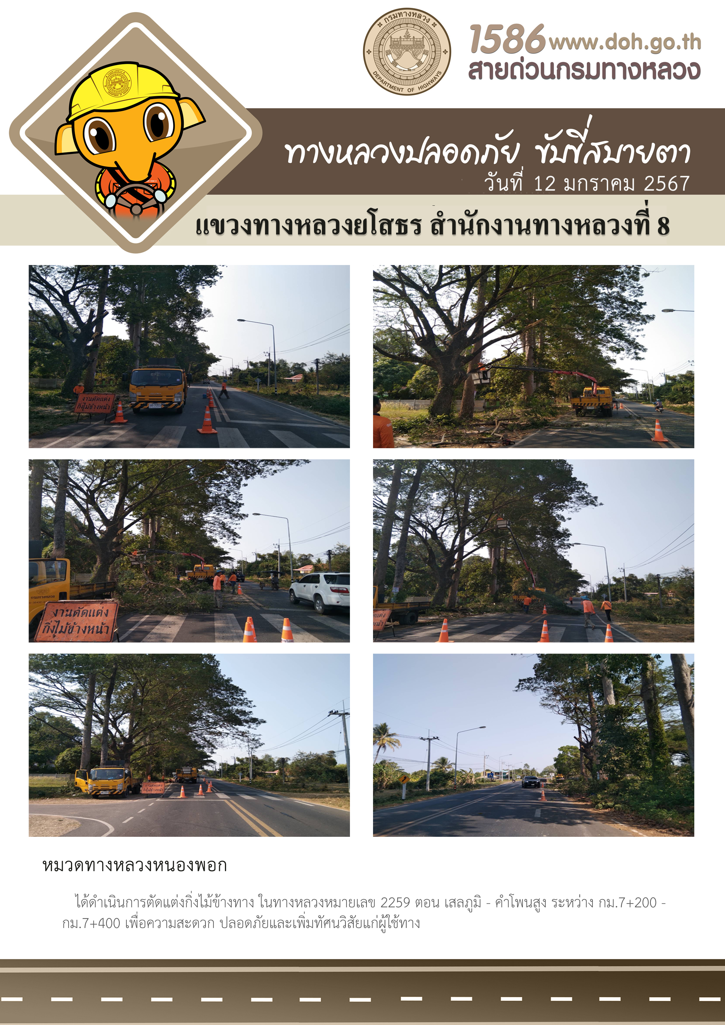 วันที่ 12 มกราคม 2567 หมวดทางหลวงหนองพอก ได้ดำเนินการตัดแต่งกิ่งไม้ข้างทาง ในทางหลวงหมายเลข 2259 ตอน เสลภูมิ - คำโพนสูง ระหว่าง กม.7+200 - กม.7+400 เพื่อความสะดวก ปลอดภัยและเพิ่มทัศนวิสัยแก่ผู้ใช้ทาง