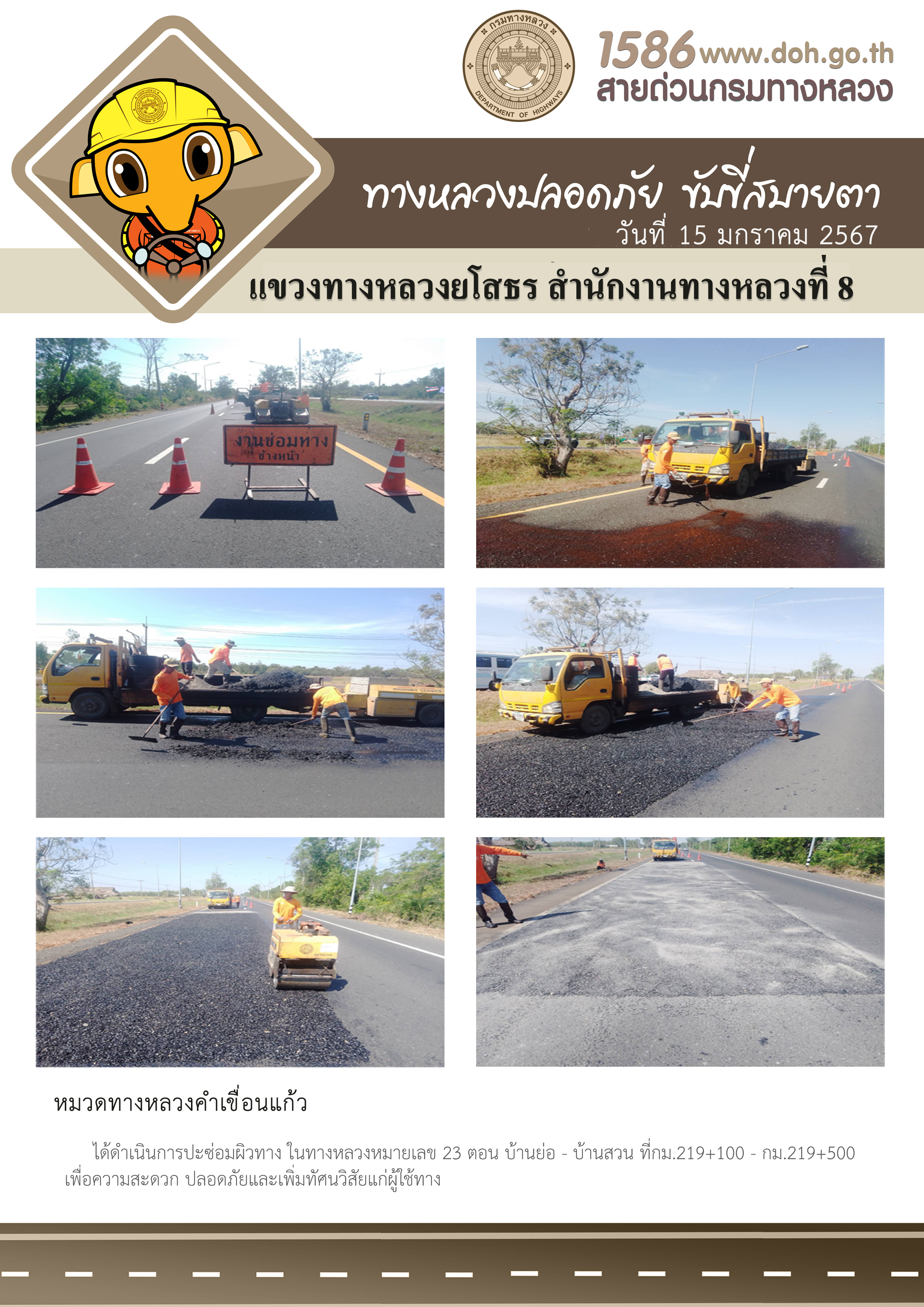 วันที่ 15 มกราคม 2567 หมวดทางหลวงคำเขื่อนแก้ว ได้ดำเนินการปะซ่อมผิวทาง ในทางหลวงหมายเลข 23 ตอน บ้านย่อ - บ้านสวน ที่ กม.219+100 - กม.219+500 เพื่อความสะดวก ปลอดภัยและเพิ่มทัศนวิสัยแก่ผู้ใช้ทาง