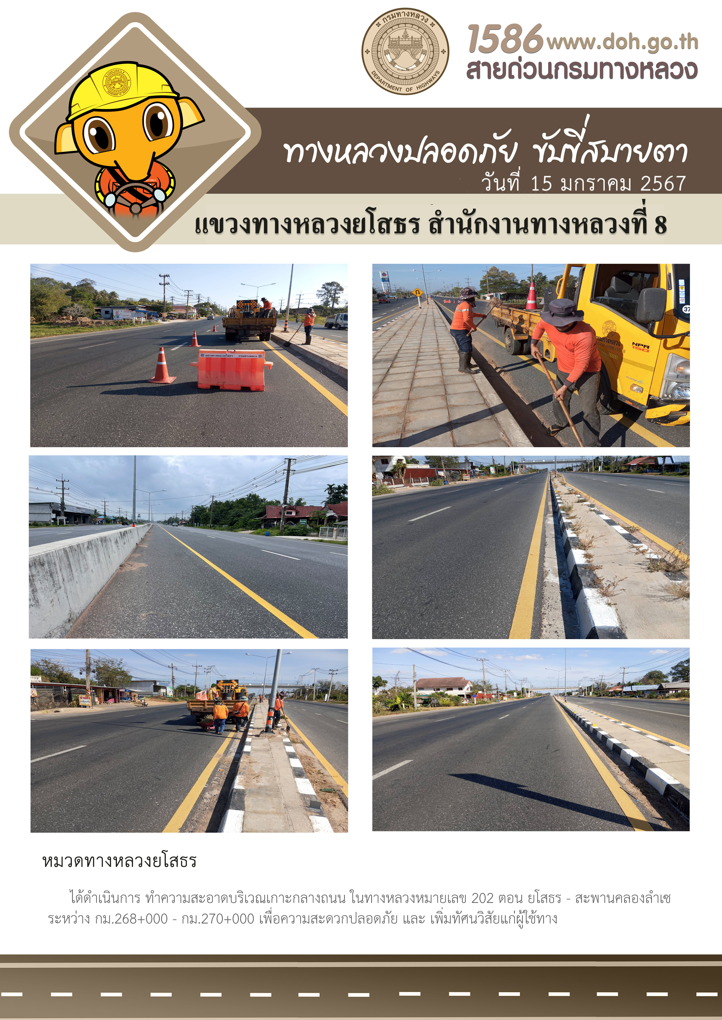 วันที่ 15 มกราคม 2567 หมวดทางหลวงยโสธร ได้ดำเนินการ ทำความสะอาดบริเวณเกาะกลางถนน ในทางหลวงหมายเลข 202 ตอน ยโสธร - สะพานคลองลำเซ ระหว่าง กม.268+000 - กม.270+000 เพื่อความสะดวกปลอดภัย และเพิ่มทัศนวิสัยแก่ผู้ใช้ทาง