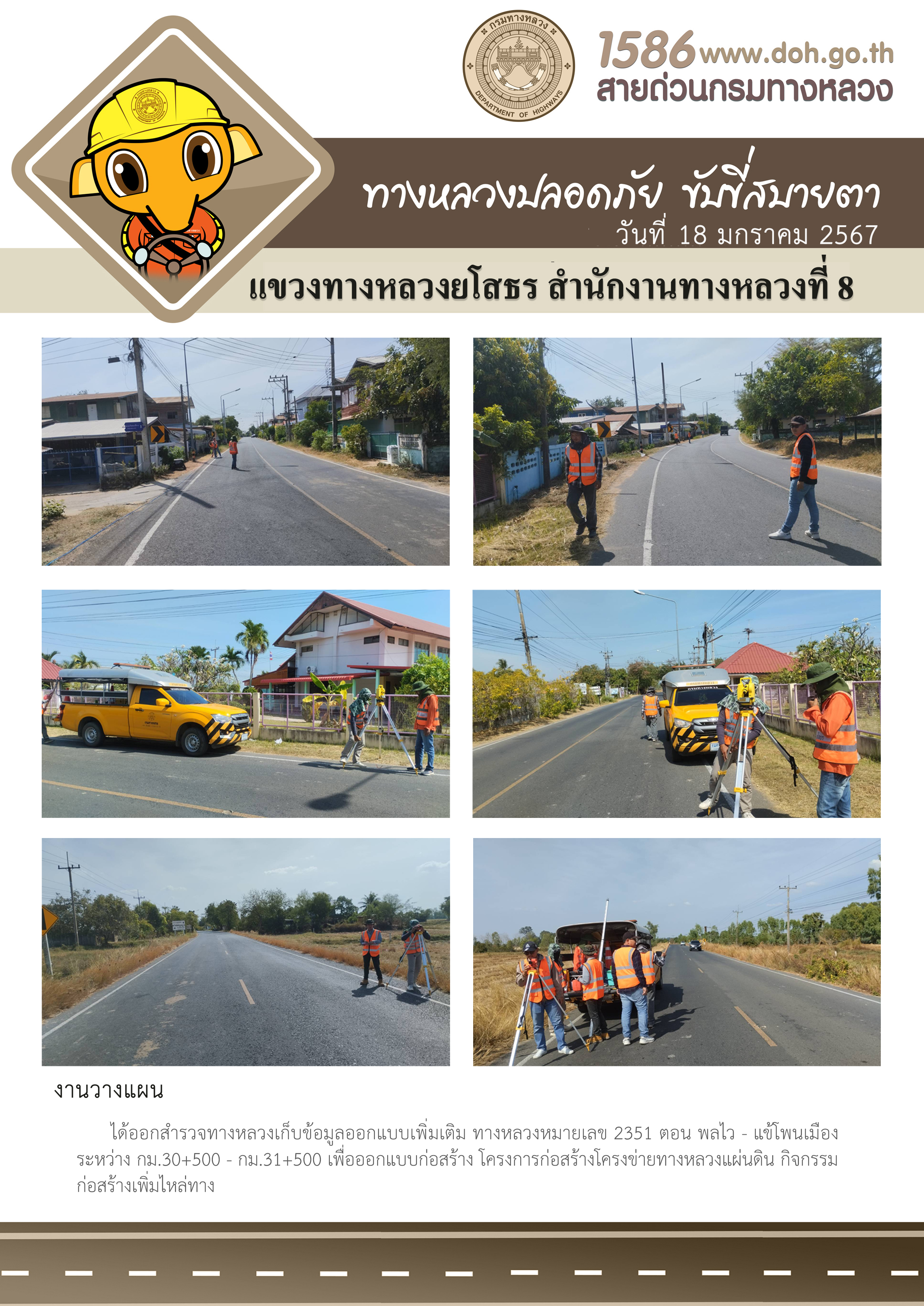 วันที่ 18 มกราคม 2567 งานวางแผน ได้ออกสำรวจทางหลวงเก็บข้อมูลออกแบบเพิ่มเติม ทางหลวงหมายเลข 2351 ตอน พลไว - แข้โพนเมือง ระหว่าง กม.30+500 - กม.31+500 เพื่อออกแบบก่อสร้าง โครงการก่อสร้างโครงข่ายทางหลวงแผ่นดิน กิจกรรม ก่อสร้างเพิ่มไหล่ทาง