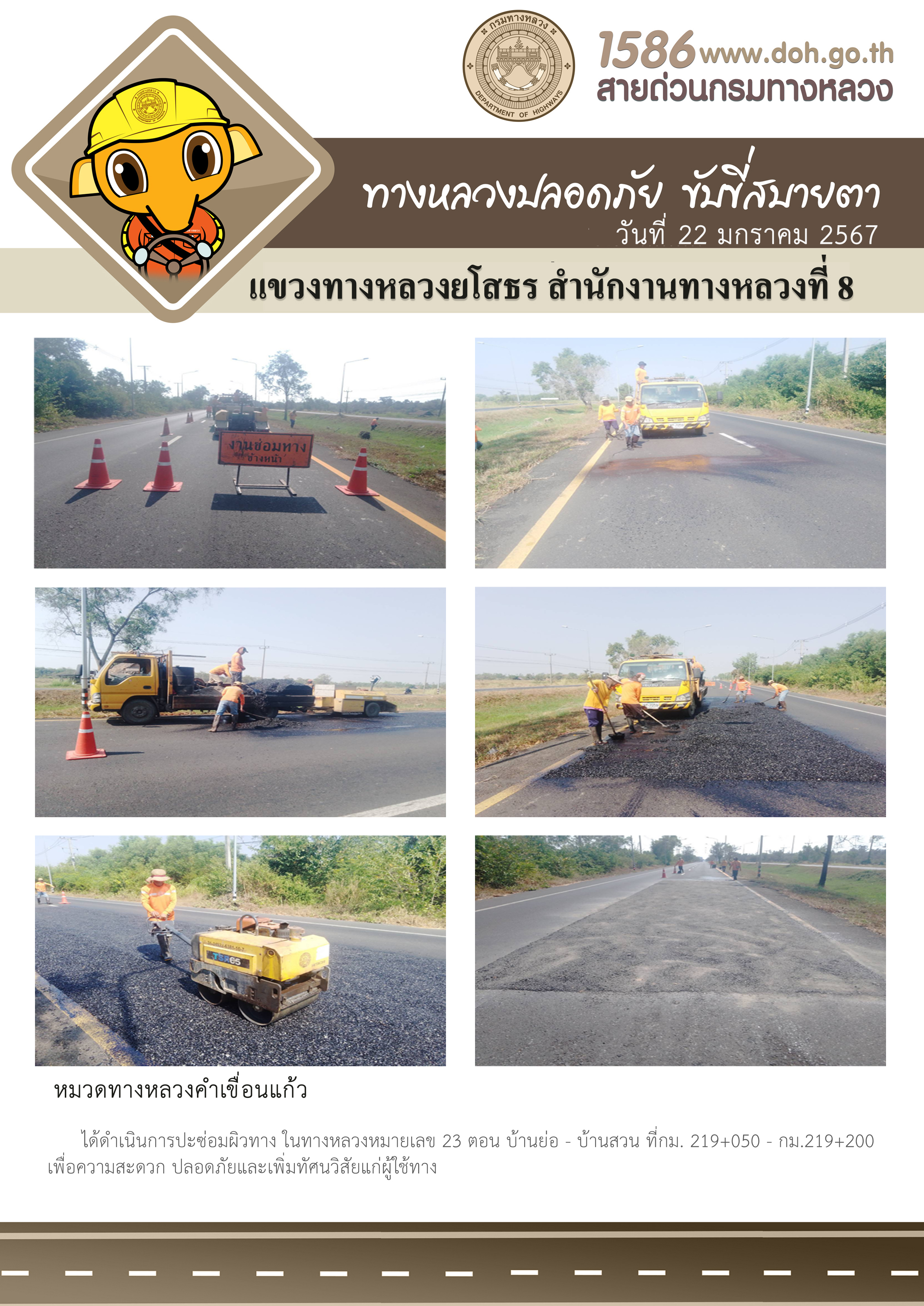 วันที่ 22 มกราคม 2567 หมวดทางหลวงคำเขื่อนแก้ว ได้ดำเนินการปะซ่อมผิวทาง ในทางหลวงหมายเลข 23 ตอน บ้านย่อ - บ้านสวน ที่ กม.219+050 - กม.219+200 เพื่อความสะดวก ปลอดภัยและเพิ่มทัศนวิสัยแก่ผู้ใช้ทาง
