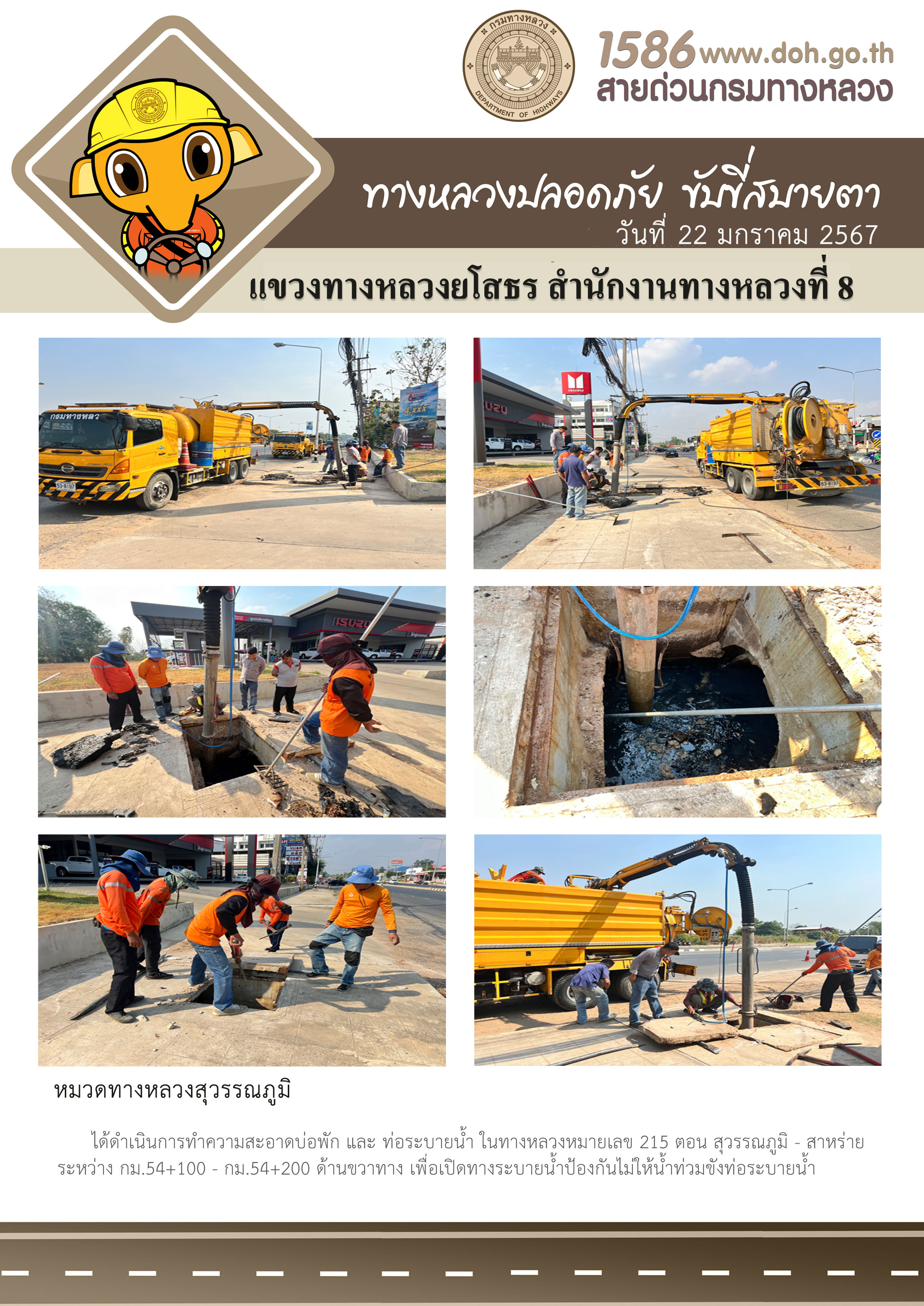 วันที่ 22 มกราคม 2567 หมวดทางหลวงสุวรรณภูมิ ได้ดำเนินการทำความสะอาดบ่อพัก และท่อระบายน้ำ ในทางหลวงหมายเลข 215 ตอน สุวรรณภูมิ - สาหร่าย ระหว่าง กม.54+100 - กม.54+200 ด้านขวาทาง เพื่อเปิดทางระบายน้ำป้องกันไม่ให้น้ำท่วมขังท่อระบายน้ำ