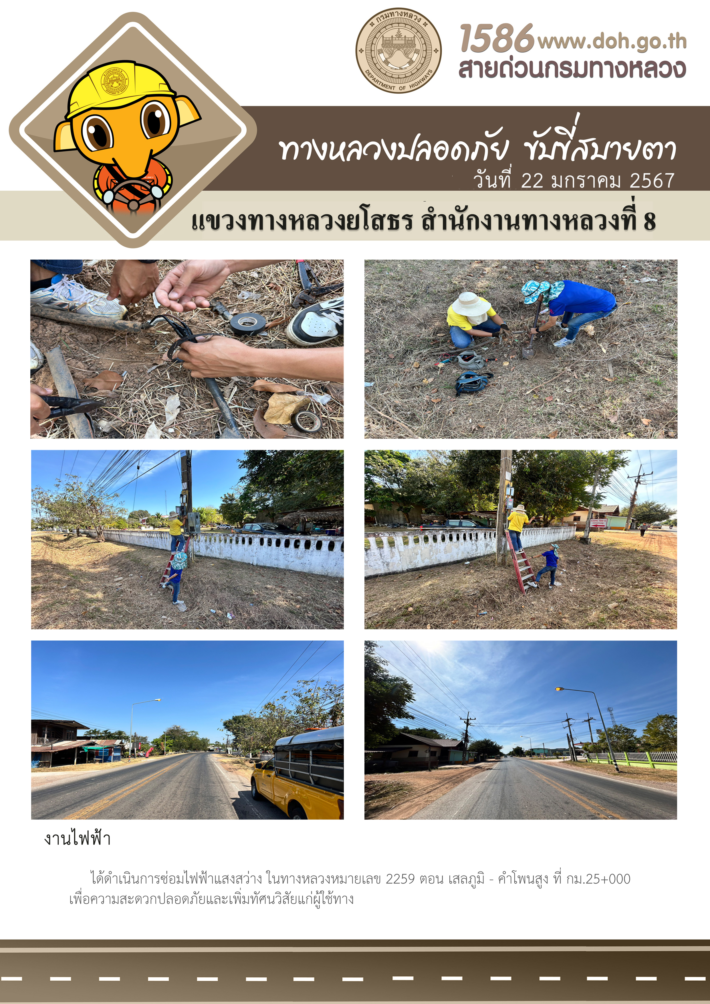 วันที่ 22 มกราคม 2567 งานไฟฟ้า ได้ดำเนินการซ่อมไฟฟ้าแสงสว่าง ในทางหลวงหมายเลข 2259 ตอน เสลภูมิ - คำโพนสูง ที่ กม.25+000 เพื่อความสะดวกปลอดภัยและเพิ่มทัศนวิสัยแก่ผู้ใช้ทาง