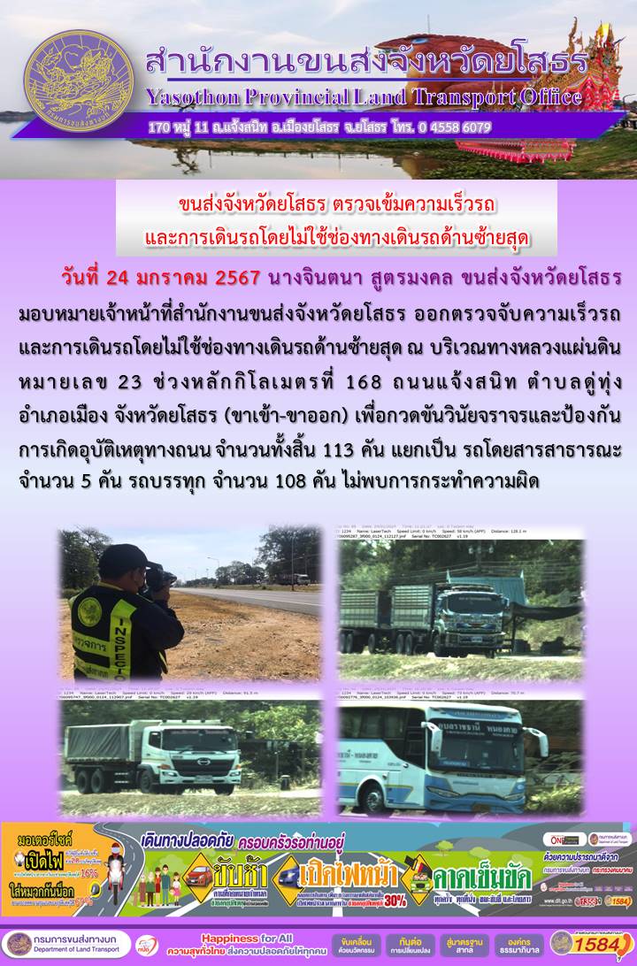 วันที่ 24 มกราคม 2567 เจ้าหน้าที่สำนักงานขนส่งจังหวัดยโสธร ออกตั้งจุดตรวจจับความเร็ว