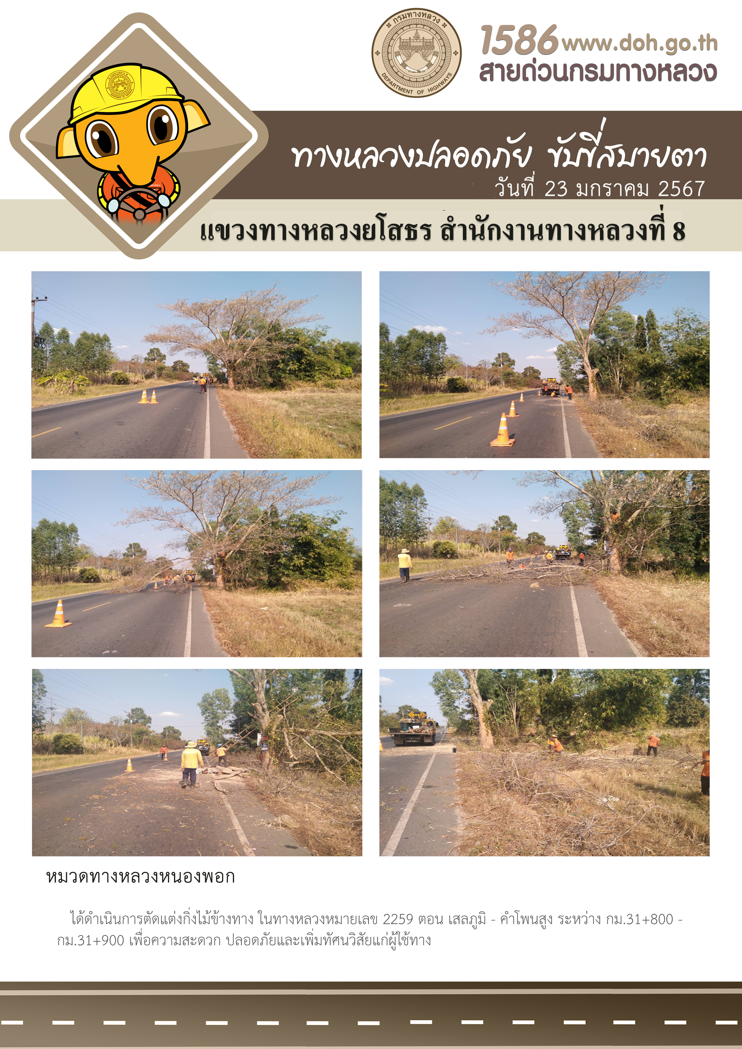 วันที่ 23 มกราคม 2567 หมวดทางหลวงหนองพอก ได้ดำเนินการตัดแต่งกิ่งไม้ข้างทาง ในทางหลวงหมายเลข 2259 ตอน เสลภูมิ - คำโพนสูง ระหว่าง กม.31+800 - กม.31+900 เพื่อความสะดวก ปลอดภัยและเพิ่มทัศนวิสัยแก่ผู้ใช้ทาง