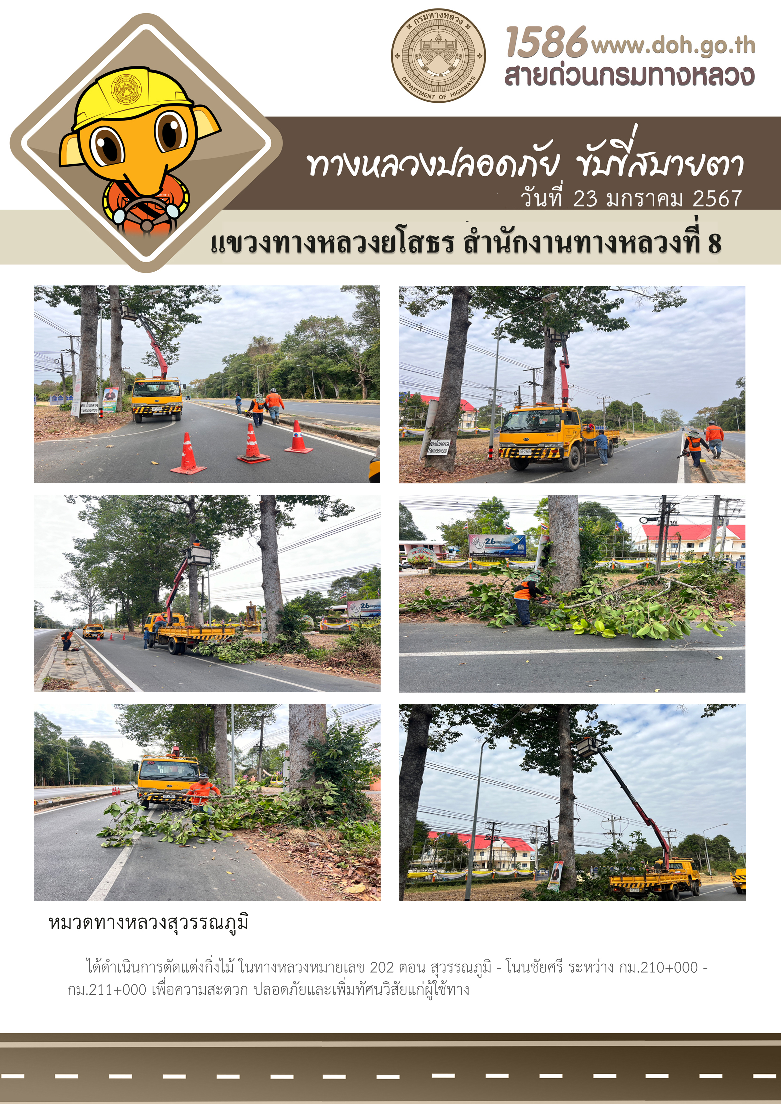 วันที่ 23 มกราคม 2567 หมวดทางหลวงสุวรรณภูมิ ได้ดำเนินการตัดแต่งกิ่งไม้ ในทางหลวงหมายเลข 202 ตอน สุวรรณภูมิ - โนนชัยศรี ระหว่าง กม.210+000 - กม.211+000 เพื่อความสะดวก ปลอดภัยและเพิ่มทัศนวิสัยแก่ผู้ใช้ทาง