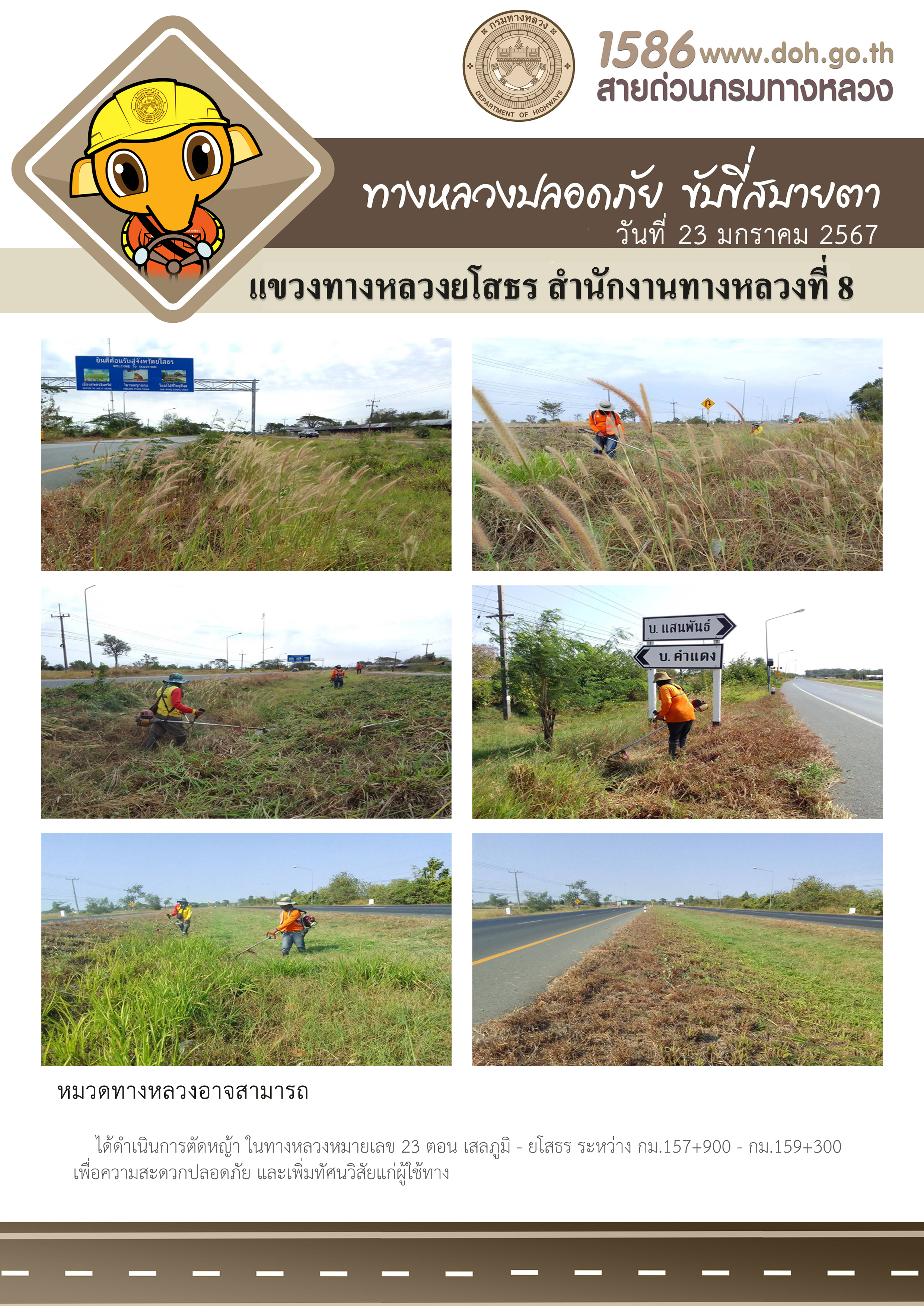 วันที่ 23 มกราคม 2567 หมวดทางหลวงอาจสามารถ ได้ดำเนินการตัดหญ้า ในทางหลวงหมายเลข 23 ตอน เสลภูมิ - ยโสธร ระหว่าง กม.157+900 - กม.159+300 เพื่อความสะดวกปลอดภัย และเพิ่มทัศนวิสัยแก่ผู้ใช้ทาง