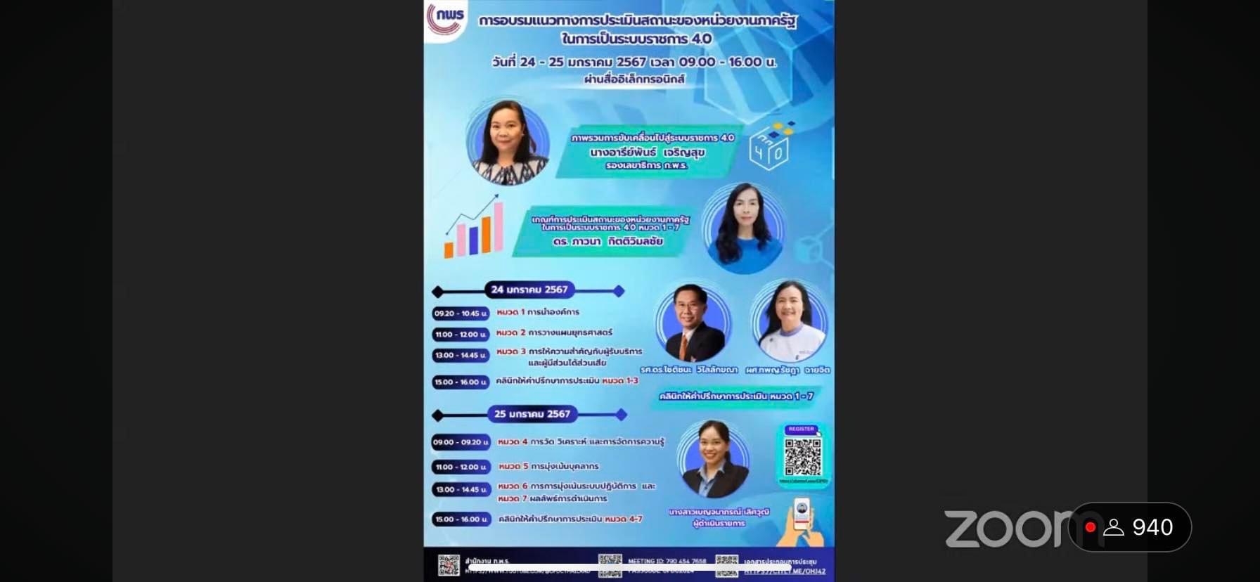 วันที่ 25 ม.ค. 2567 (08:52 น.)วันพุธ ที่ ๒๔ มกราคม ๒๕๖๗ ระหว่างเวลา ๐๘.๓๐ - ๑๖.๐๐ นาฬิกา นางสาวนฤมล แสนทวีสุข ผู้อำนวยการสำนักงานคุมประพฤติจังหวัดยโสธร มอบหมายให้ นางสาวปาณิสรา แก้วโมลี พนักงานคุมประพฤติชำนาญการ หัวหน้ากลุ่มคุมประพฤติ พื้นที่ ๓ ร่วมอบรมแนวทางการประเมินสถานะของหน่วยงานภาครัฐในการเป็นระบบราชการ ๔.๐ เพื่อสร้างความรู้ ความเข้าใจในการเตรียมความพร้อมสำหรับการประเมินสถานะของหน่วยงานภาครัฐในการเป็นระบบราชการ ๔.๐ สำหรับการประเมินส่วนราชการตามมาตราการปรับปรุงประสิทธิภาพในการปฏิบัติราชการ ปีงบประมาณ พ.ศ. ๒๕๖๗ ผ่านโปรแกรม Cisco Webex Meeting ของสำนักงาน ก.พ.ร. ณ สำนักงานคุมประพฤติจังหวัดยโสธร โดยมี ดร.ภาวนา กิตติวิมลชัย รักษาการผู้อำนวยการกองพัฒาคุณภาพการศึกษามหาวิทยาลัยขอนแก่น เป็นผู้ชี้แจงเกณฑ์การประเมิน จากสำนักงานคณะกรรมการพัฒนาระบบราชการ ถนนพิษณุโลก กรุงเทพมหานคร