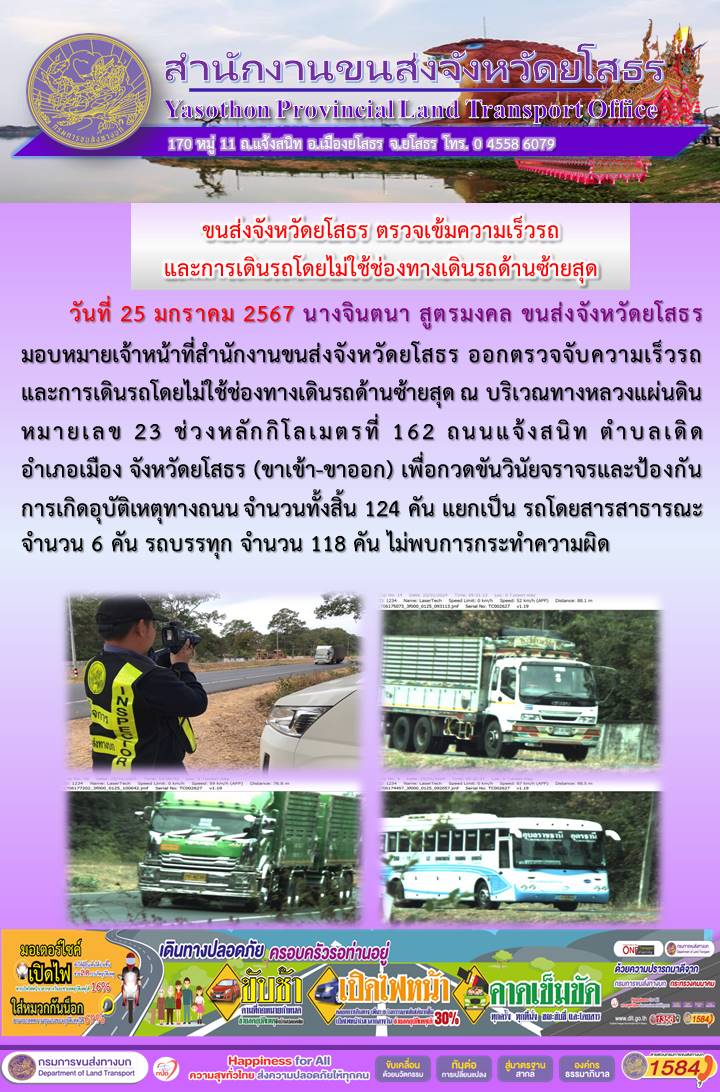 วันที่ 25 มกราคม 2567 เจ้าหน้าที่สำนักงานขนส่งจังหวัดยโสธร ออกตั้งจุดตรวจจับความเร็ว