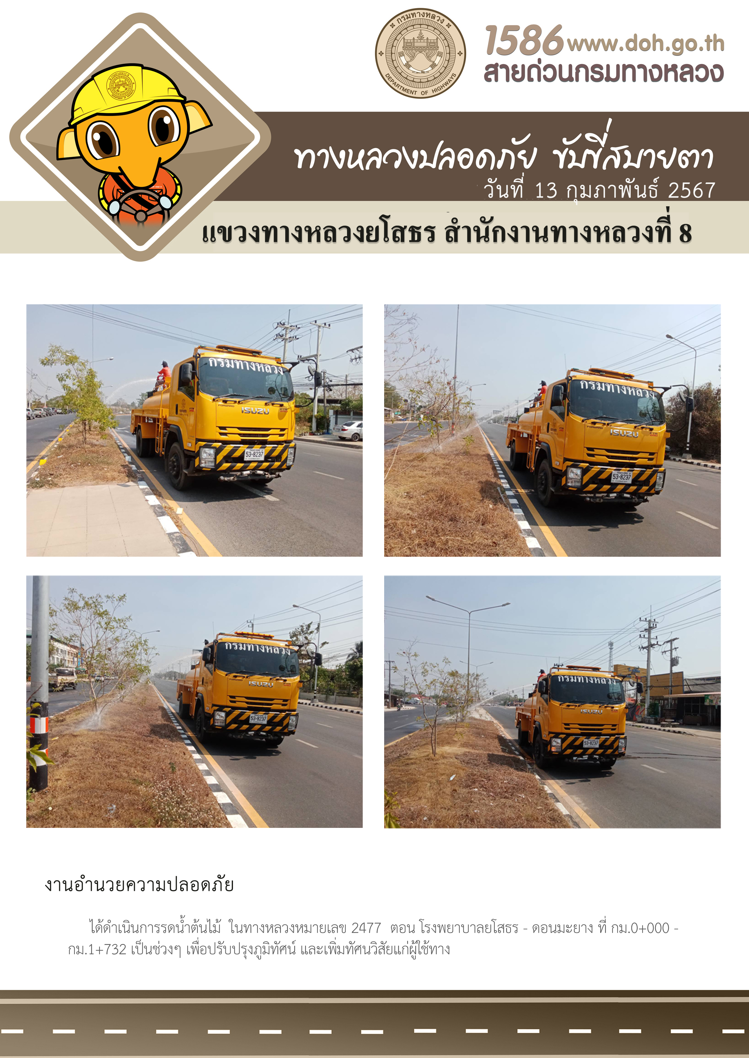 วันที่ 13 กุมภาพันธ์ 2567 งานอำนวยความปลอดภัย ได้ดำเนินการรดน้ำต้นไม้ ในทางหลวงหมายเลข 2477 ตอน โรงพยาบาลยโสธร - ดอนมะยาง ที่ กม.0+000 - กม.1+732 เป็นช่วงๆ เพื่อปรับปรุงภูมิทัศน์ และเพิ่มทัศนวิสัยแก่ผู้ใช้ทาง
