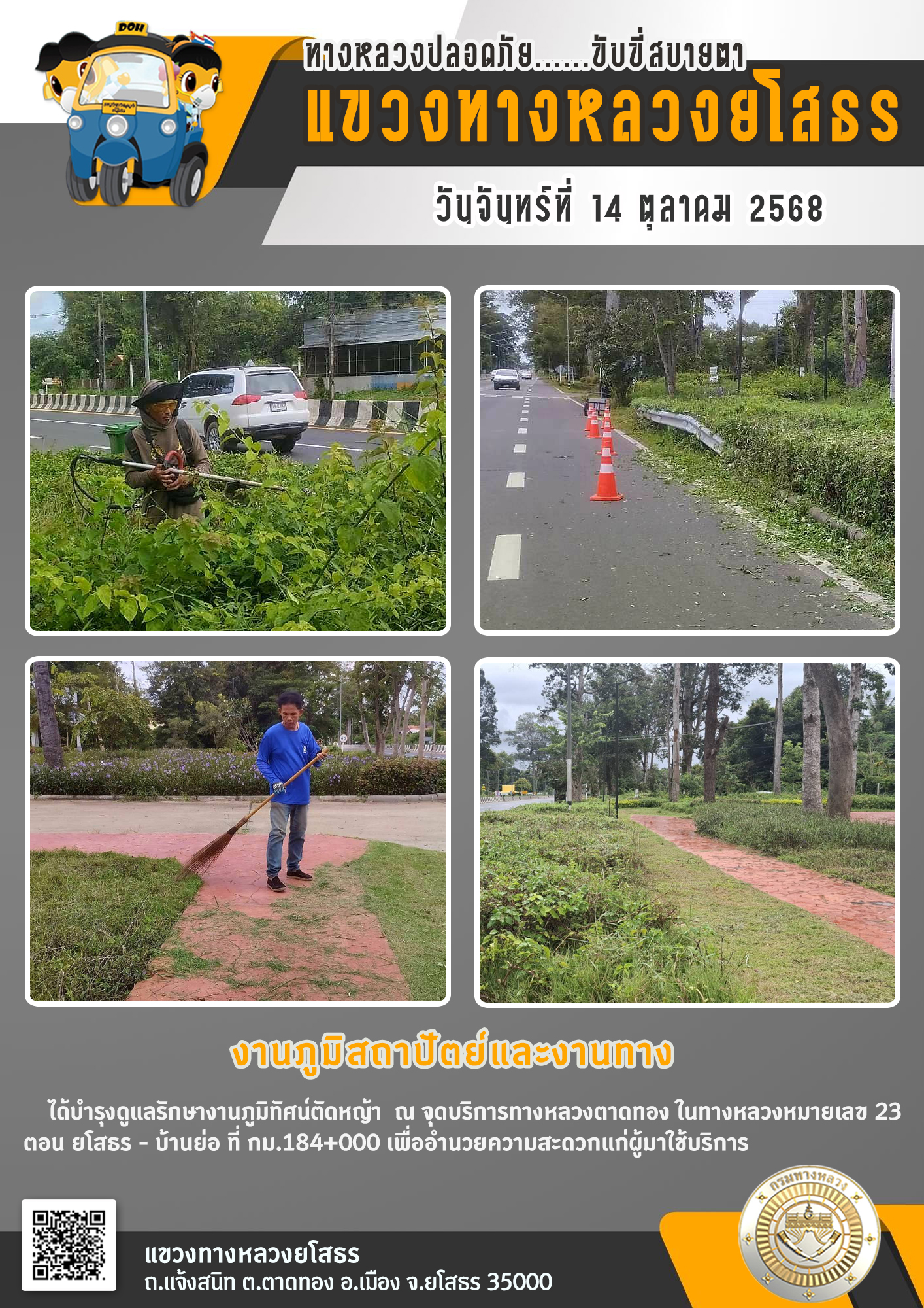 วันจันทร์ที่ 14 ตุลาคม 2568 งานภูมิสถาปัตย์และงานทาง ได้บำรุงดูแลรักษางานภูมิทัศน์ตัดหญ้า ณ จุดบริการทางหลวงตาดทอง ในทางหลวงหมายเลข 23 ตอน ยโสธร - บ้านย่อ ที่ กม.184+000 เพื่ออำนวยความสะดวกแก่ผู้มาใช้บริการ