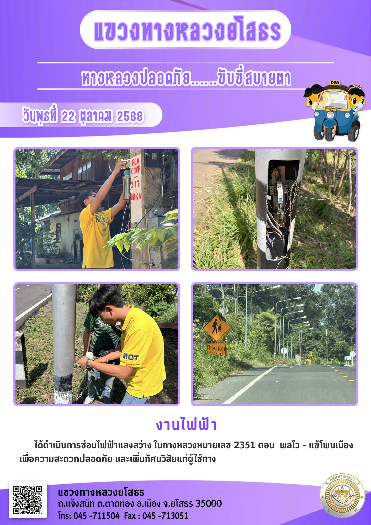 วันพุธที่ 22 ตุลาคม 2568 งานไฟฟ้า ได้ดำเนินการซ่อมไฟฟ้าแสงสว่าง ในทางหลวงหมายเลข 2351 ตอน พลไว - แข้โพนเมือง เพื่อความสะดวกปลอดภัย และเพิ่มทัศนวิสัยแก่ผู้ใช้ทาง