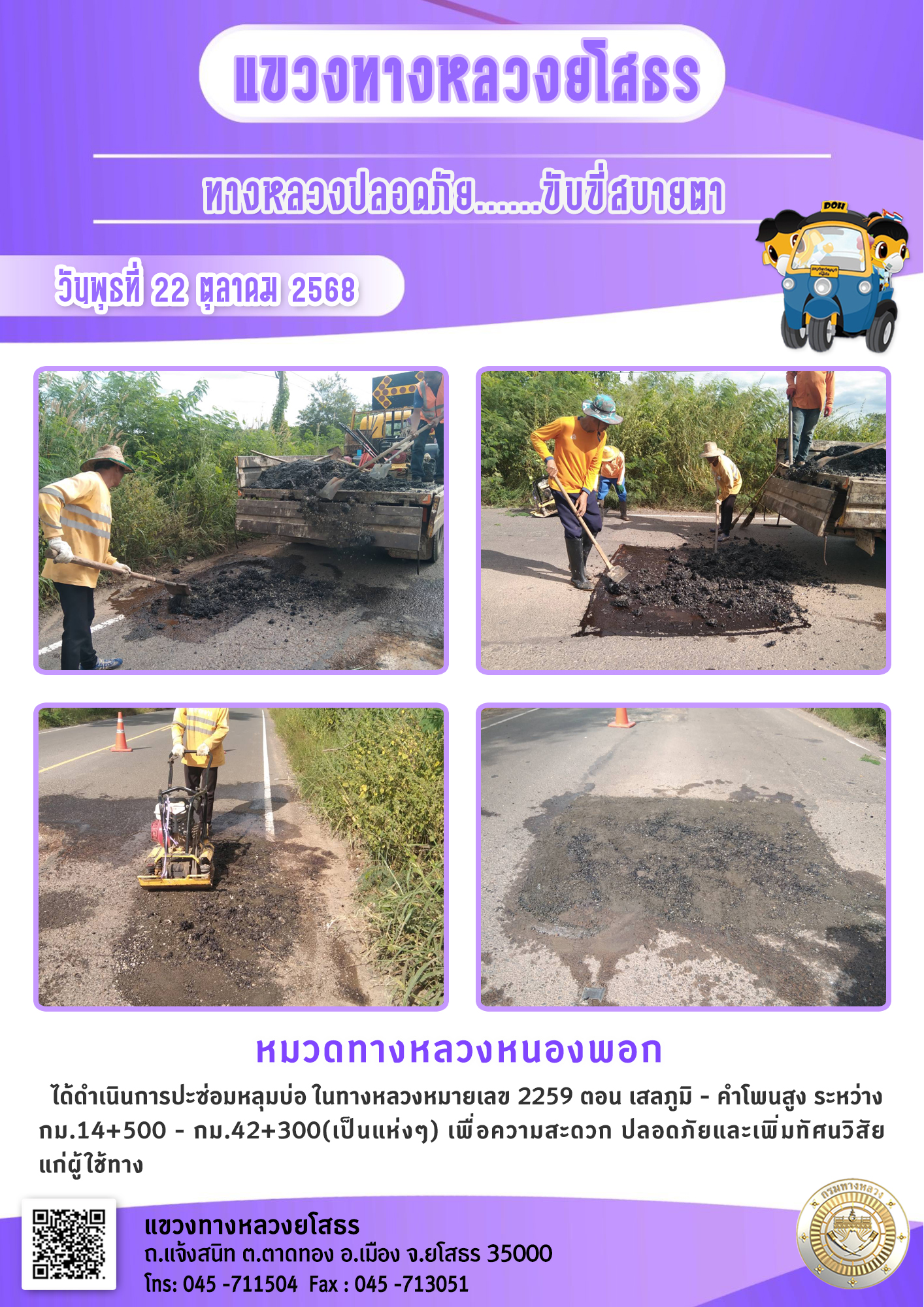 วันพุธที่ 22 ตุลาคม 2568 หมวดทางหลวงหนองพอก ได้ดำเนินการปะซ่อมหลุมบ่อ ในทางหลวงหมายเลข 2259 ตอน เสลภูมิ - คำโพนสูง ระหว่าง กม.14+500 - กม.42+300(เป็นแห่งๆ) เพื่อความสะดวก ปลอดภัยและเพิ่มทัศนวิสัย แก่ผู้ใช้ทาง