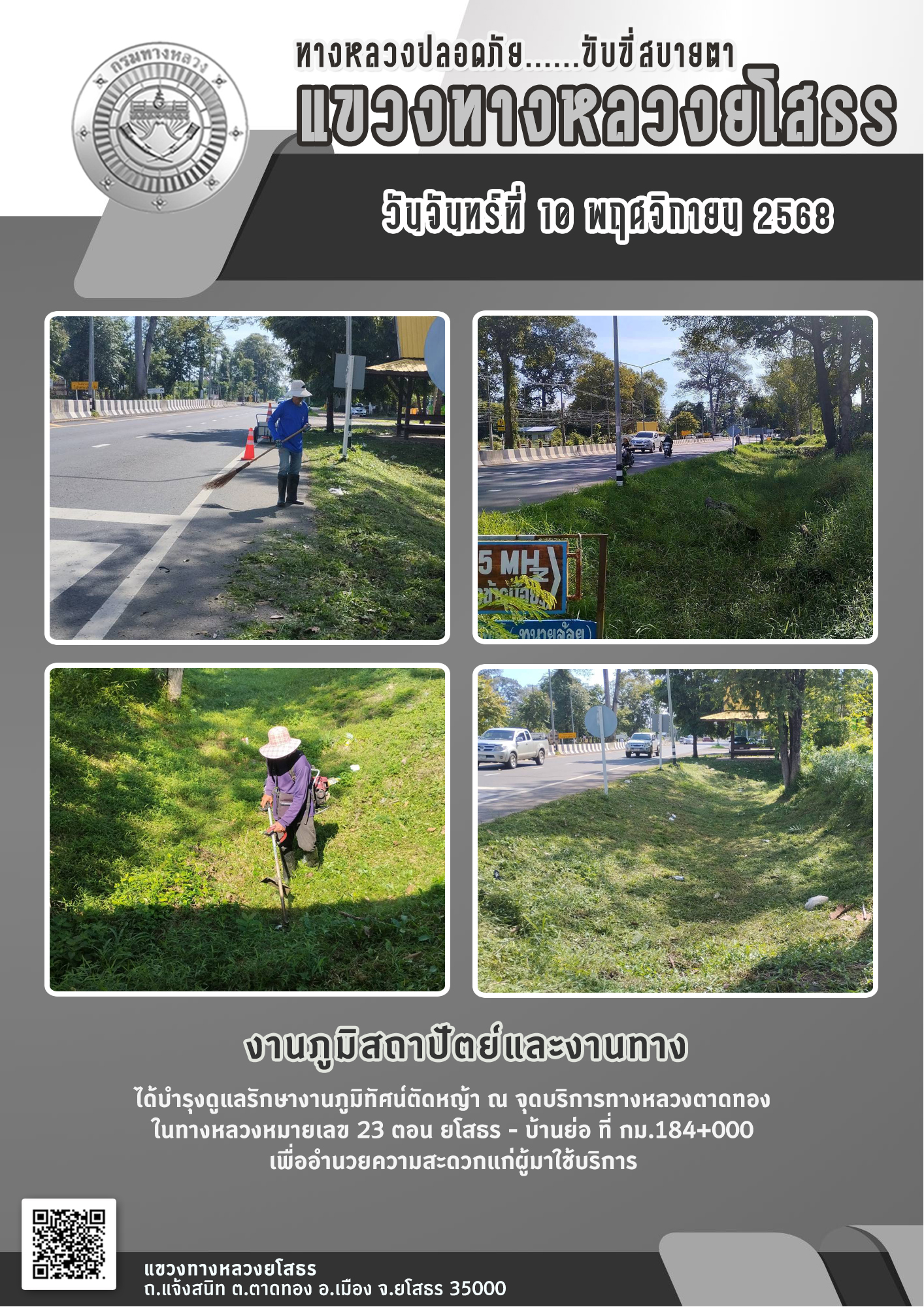 วันจันทร์ที่ 10 พฤศจิกายน 2568 งานภูมิสถาปัตย์และงานทาง ได้บำรุงดูแลรักษางานภูมิทัศน์ตัดหญ้า ณ จุดบริการทางหลวงตาดทอง ในทางหลวงหมายเลข 23 ตอน ยโสธร - บ้านย่อ ที่ กม.184+000 เพื่ออำนวยความสะดวกแก่ผู้มาใช้บริการ