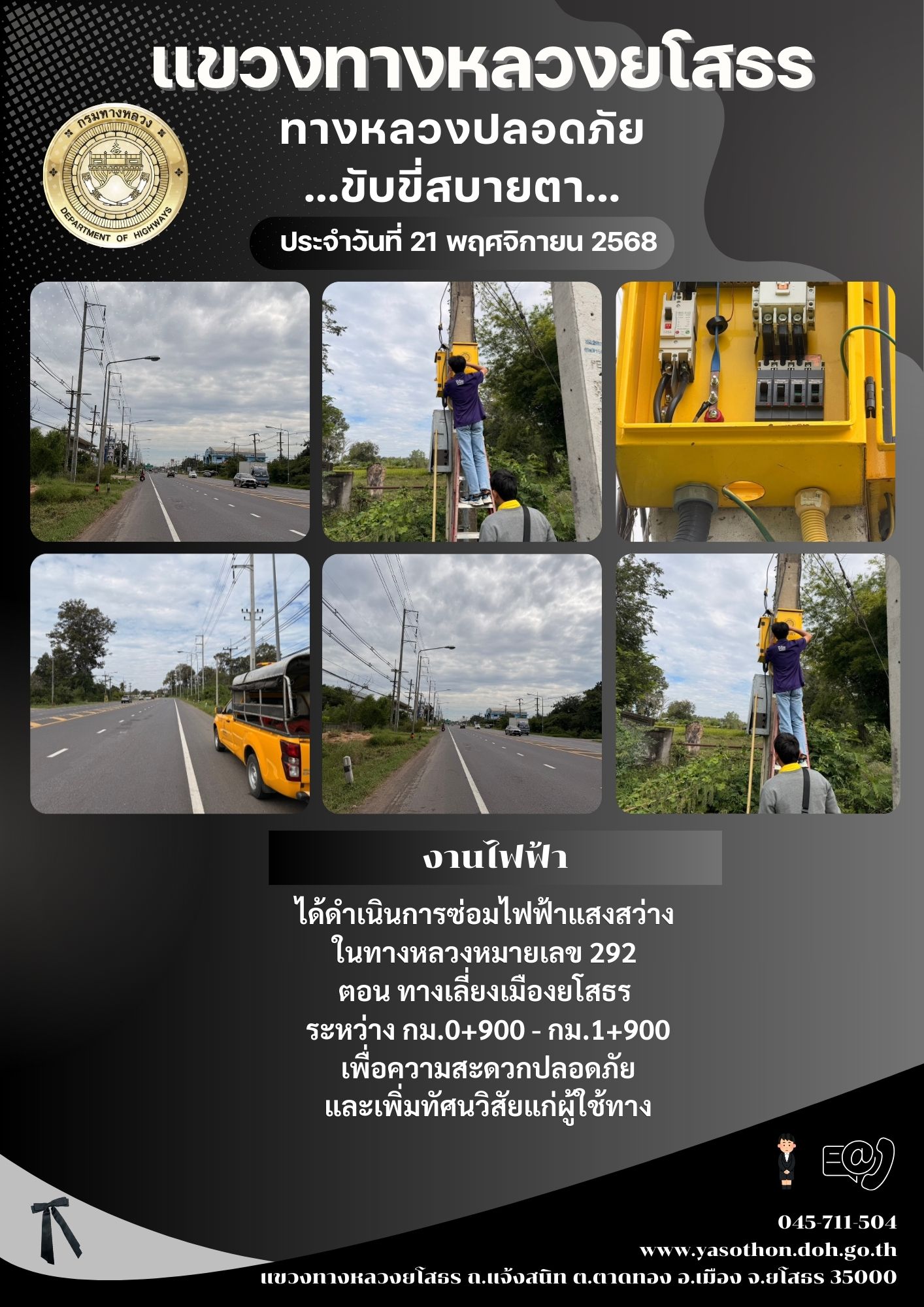 วันที่ 21 พฤศจิกายน 2568 งานไฟฟ้า ได้ดำเนินการซ่อมไฟฟ้าแสงสว่าง ในทางหลวงหมายเลข 292 ตอน ทางเลี่ยงเมืองยโสธร ระหว่าง กม.0+900 - กม.1+900 เพื่อความสะดวกปลอดภัย และเพิ่มทัศนวิสัยแก่ผู้ใช้ทาง