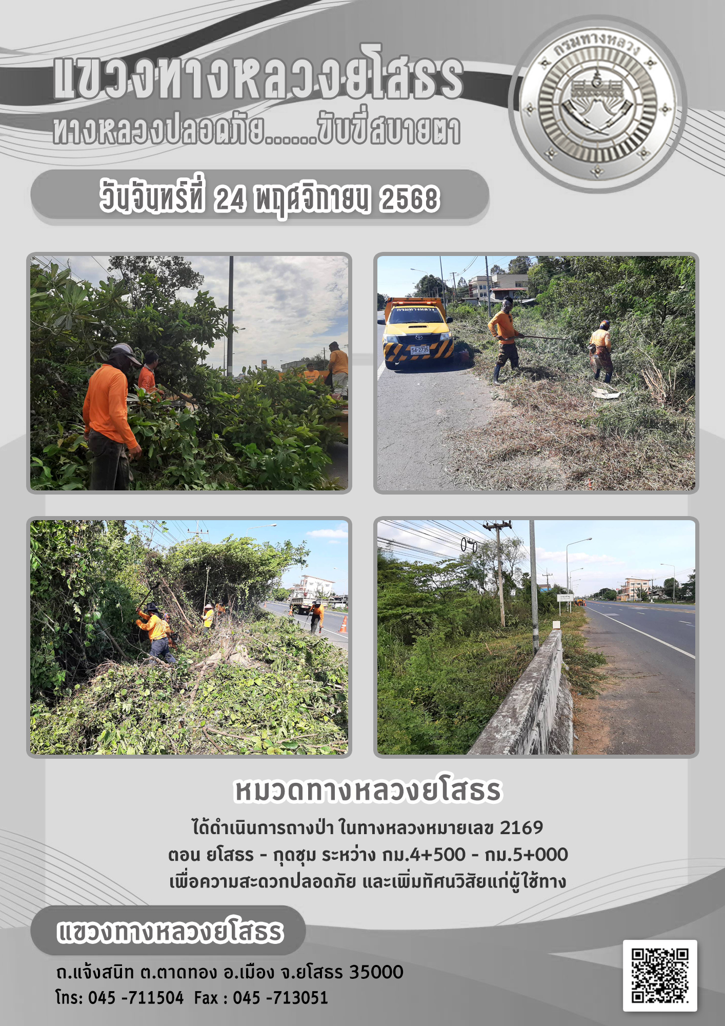 - [09:52] ทั่วไป วันจันทร์ที่ 24 พฤศจิกายน 2568 หมวดทางหลวงยโสธร ได้ดำเนินการถางป่า ในทางหลวงหมายเลข 2169 ตอน ยโสธร - กุดชุม ระหว่าง กม.4+500 - กม.5+000 เพื่อความสะดวกปลอดภัย และเพิ่มทัศนวิสัยแก่ผู้ใช้ทาง