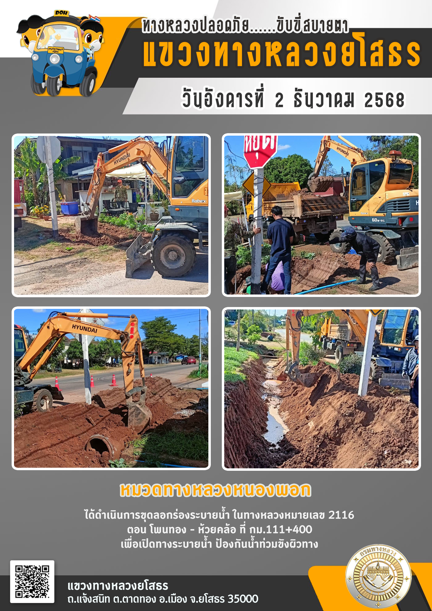 วันอังคารที่ 2 ธันวาคม 2568 หมวดทางหลวงหนองพอก ได้ดำเนินการขุดลอกร่องระบายน้ำ ในทางหลวงหมายเลข 2116 ตอน โพนทอง - ห้วยคล้อ ที่ กม.111+400 เพื่อเปิดทางระบายน้ำ ป้องกันน้ำท่วมขังผิวทาง