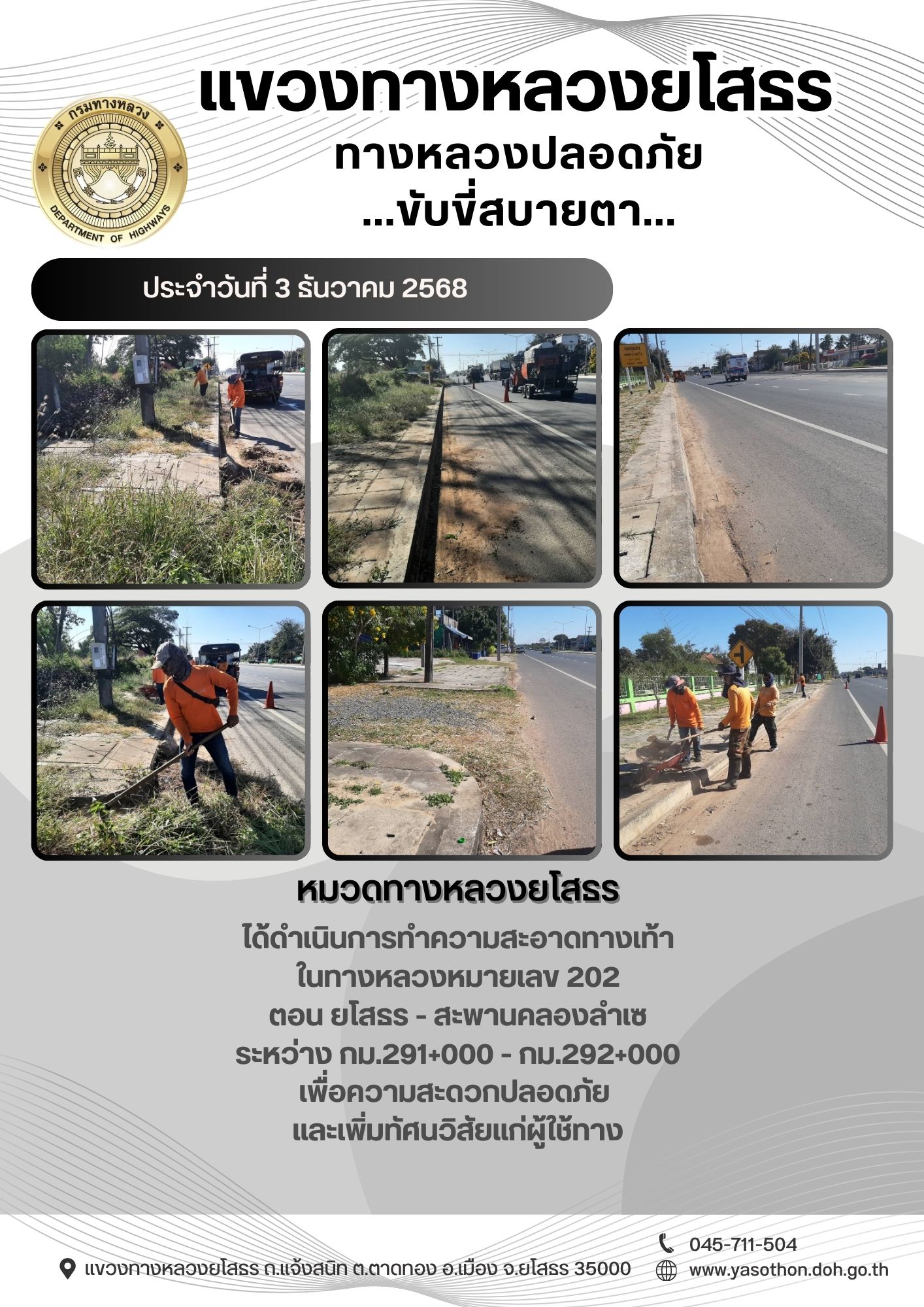 วันพุธที่ 3 ธันวาคม 2568 หมวดทางหลวงยโสธร ได้ดำเนินการทำความสะอาดทางเท้า ในทางหลวงหมายเลข 202 ตอน ยโสธร - สะพานคลองลำเซ ระหว่าง กม.291+000 - กม.292+000 เพื่อความสะดวกปลอดภัย และเพิ่มทัศนวิสัยแก่ผู้ใช้ทาง