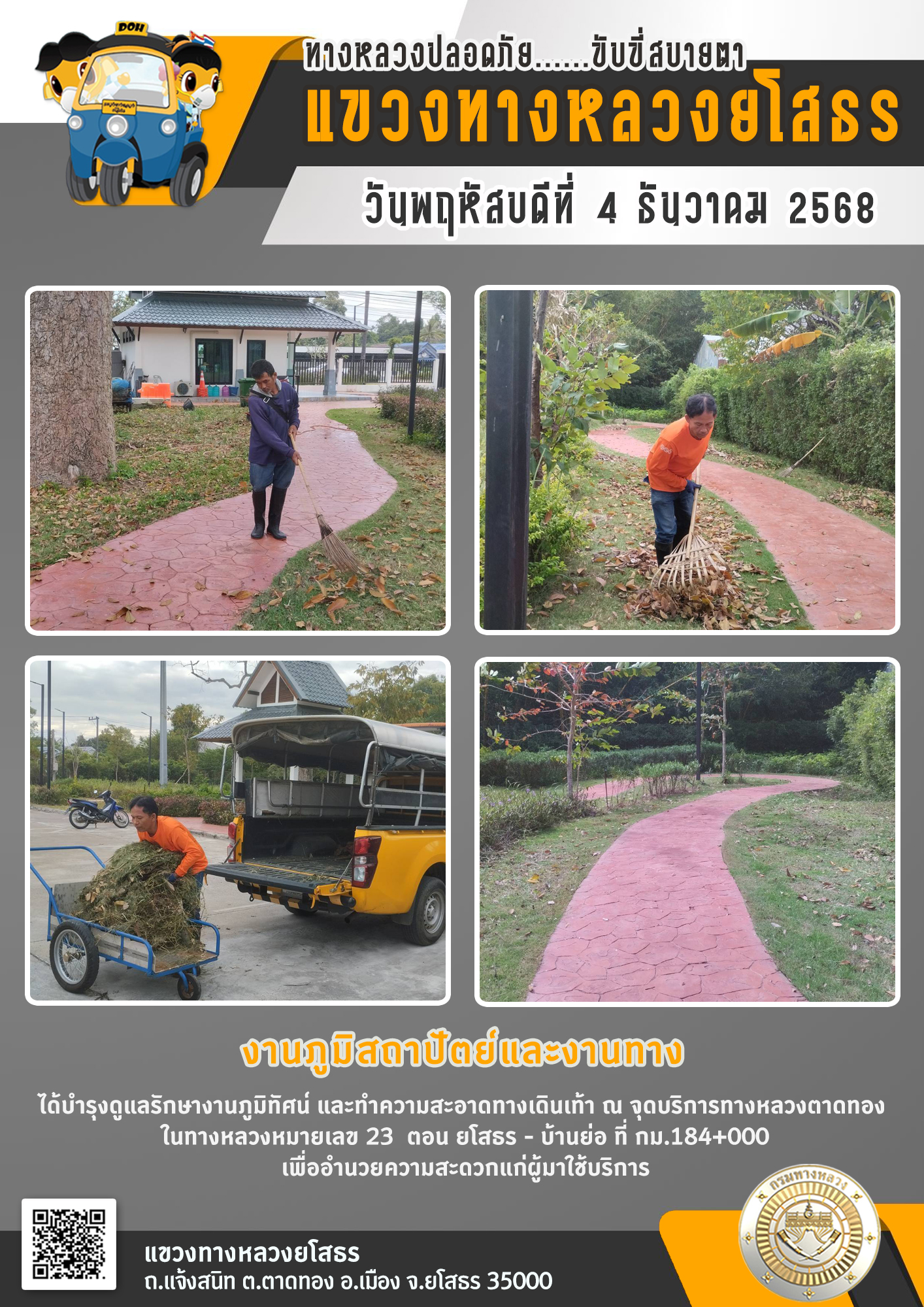 วันพฤหัสบดีที่ 4 ธันวาคม 2568 งานภูมิสถาปัตย์และงานทาง ได้บำรุงดูแลรักษางานภูมิทัศน์ และทำความสะอาดทางเดินเท้า ณ จุดบริการทางหลวงตาดทอง ในทางหลวงหมายเลข 23 ตอน ยโสธร - บ้านย่อ ที่ กม.184+000 เพื่ออำนวยความสะดวกแก่ผู้มาใช้บริการ