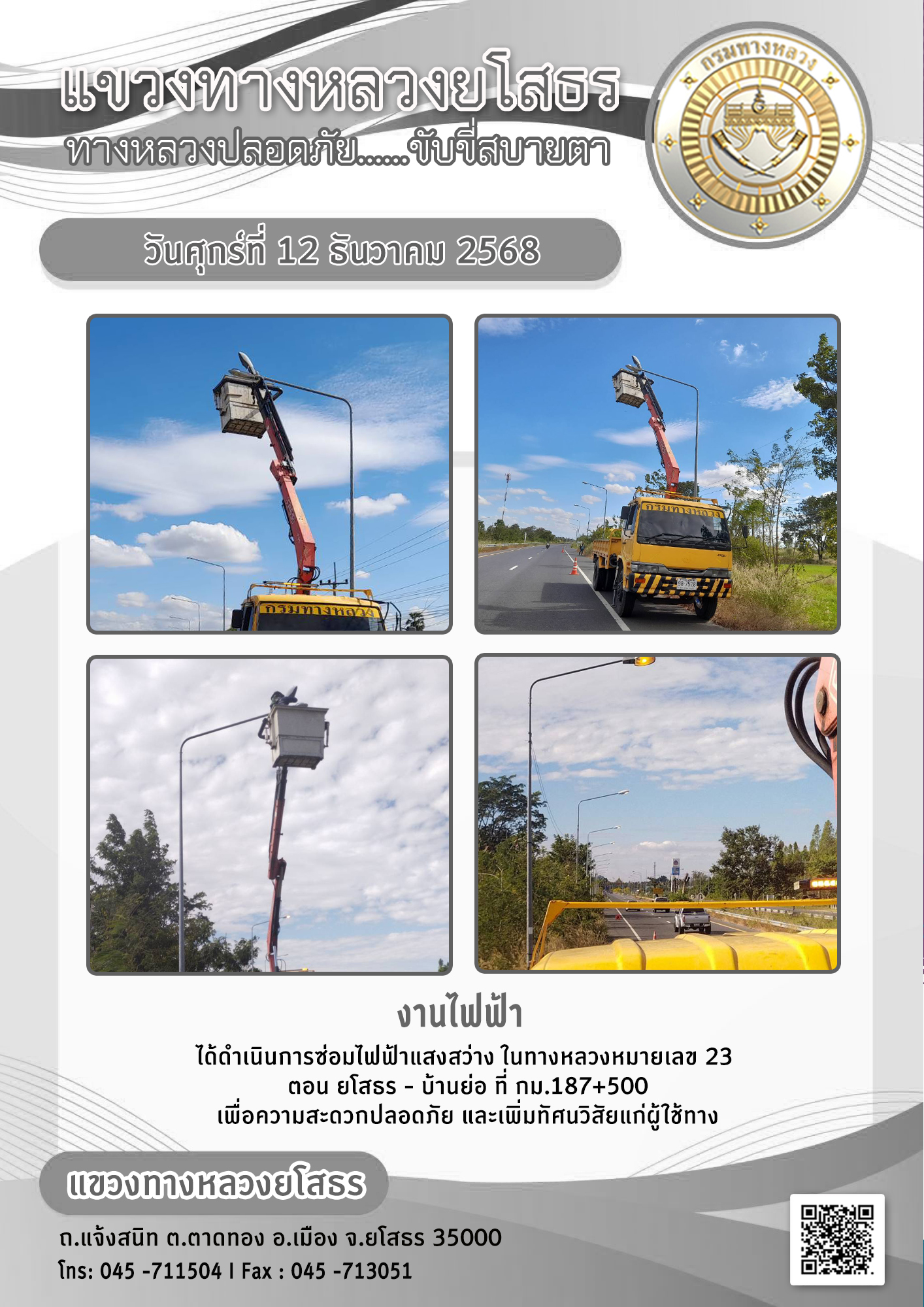 วันศุกร์ที่ 12 ธันวาคม 2568 งานไฟฟ้า ได้ดำเนินการซ่อมไฟฟ้าแสงสว่าง ในทางหลวงหมายเลข 23 ตอน ยโสธร - บ้านย่อ ที่ กม.187+500 เพื่อความสะดวกปลอดภัย และเพิ่มทัศนวิสัยแก่ผู้ใช้ทาง