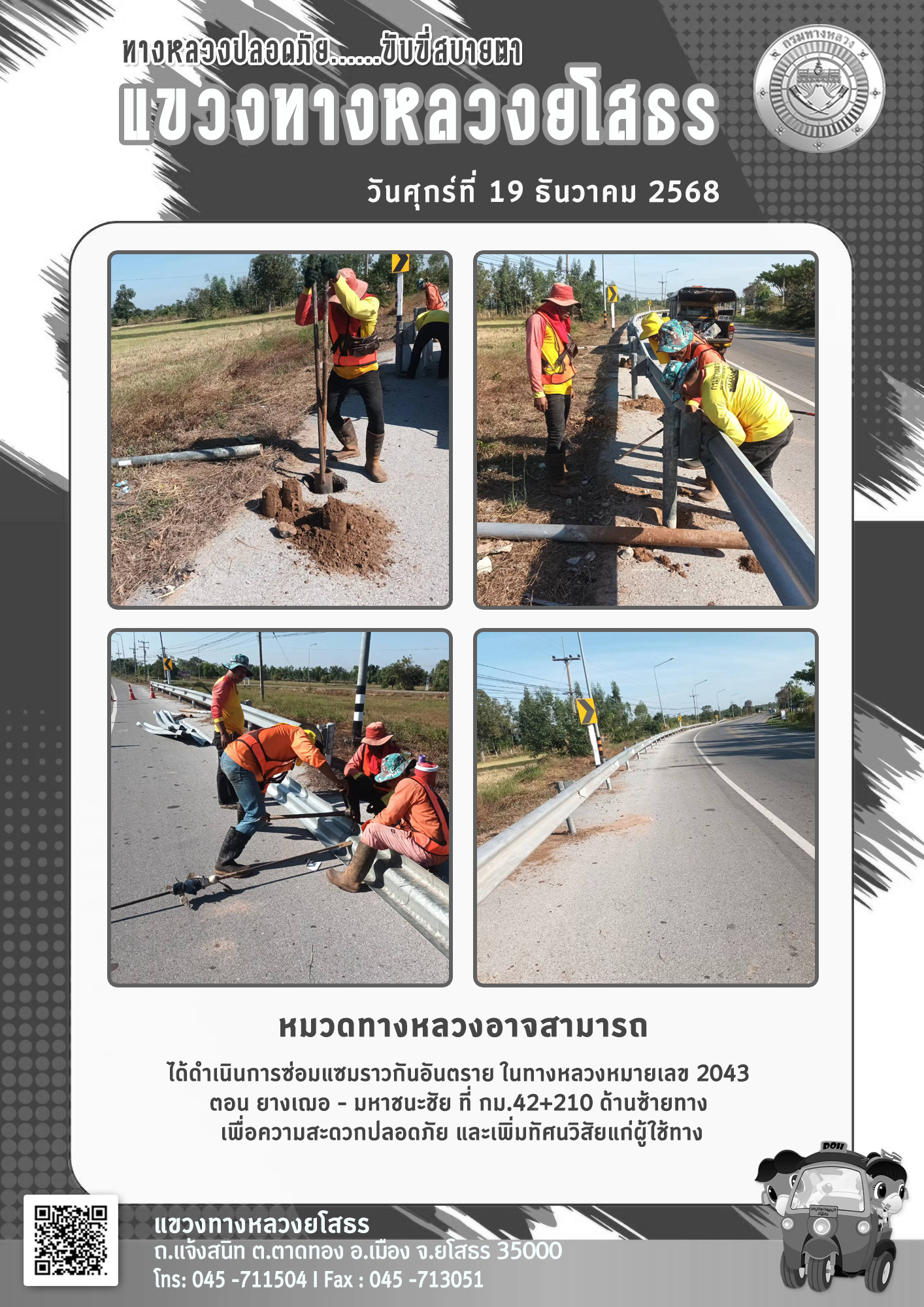 - [10:36] ทั่วไป วันศุกร์ที่ 19 ธันวาคม 2568 หมวดทางหลวงอาจสามารถ ได้ดำเนินการซ่อมแซมราวกันอันตราย ในทางหลวงหมายเลข 2043 ตอน ยางเฌอ - มหาชนะชัย ที่ กม.42+210 ด้านซ้ายทาง เพื่อความสะดวกปลอดภัย และเพิ่มทัศนวิสัยแก่ผู้ใช้ทาง