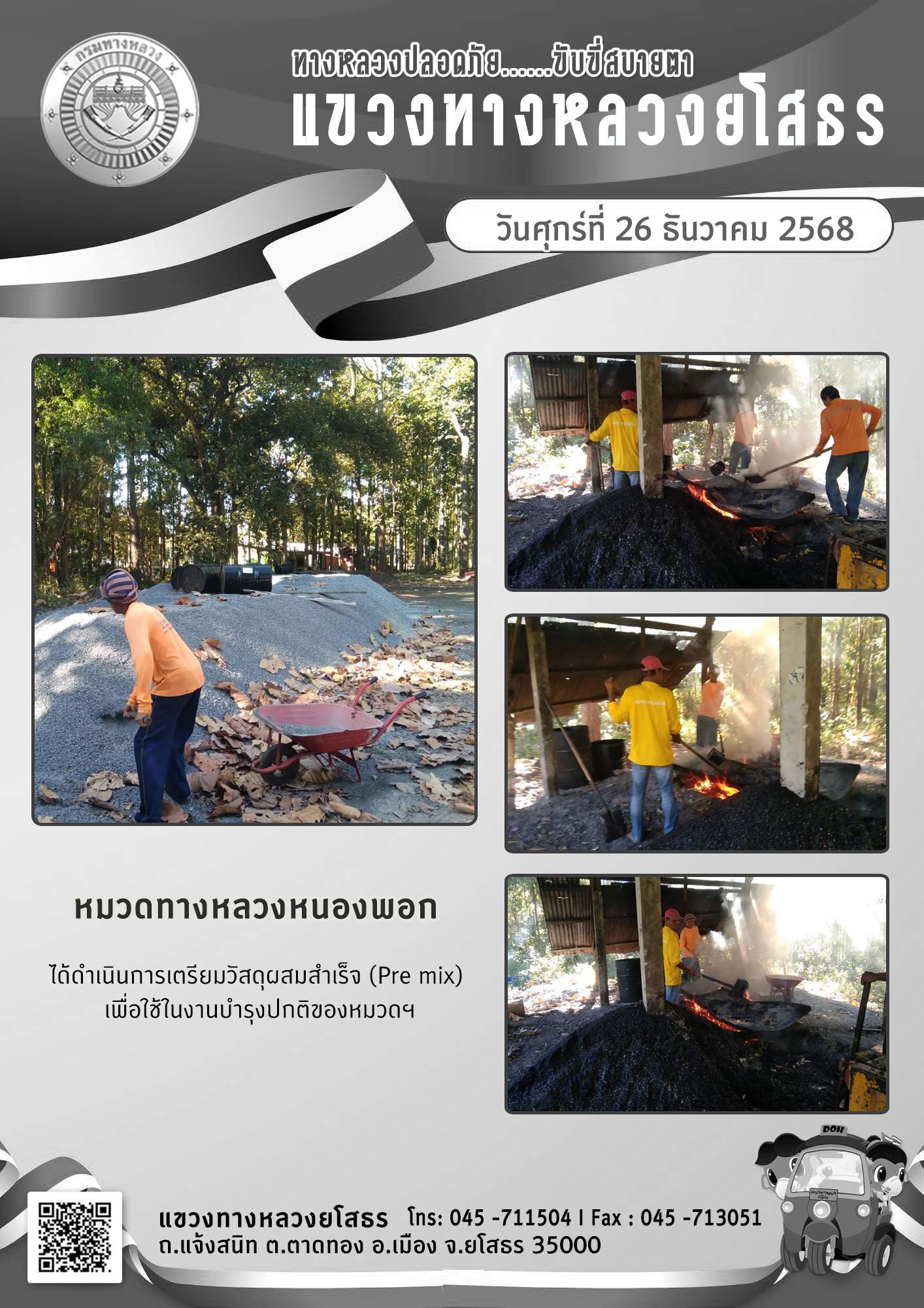 วันศุกร์ที่ 26 ธันวาคม 2568 หมวดทางหลวงหนองพอก ได้ดำเนินการเตรียมวัสดุผสมสำเร็จ (Pre mix) เพื่อใช้ในงานบำรุงปกติของหมวดฯ