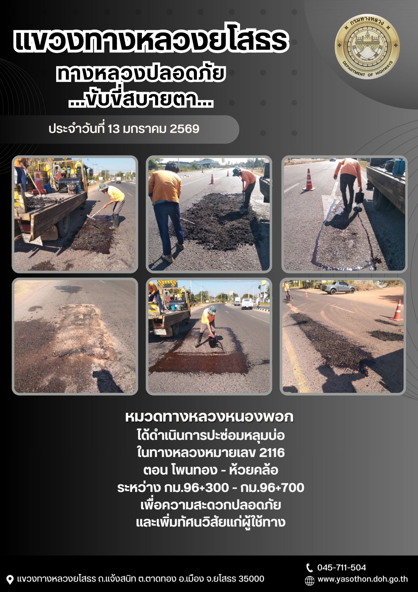 วันที่ 13 มกราคม 2569 หมวดทางหลวงหนองพอก ได้ดำเนินการปะซ่อมหลุมบ่อ ในทางหลวงหมายเลข 2116 ตอน โพนทอง - ห้วยคล้อ ระหว่าง กม.96+300 - กม.96+700 เพื่อความสะดวกปลอดภัย และเพิ่มทัศนวิสัยแก่ผู้ใช้ทาง