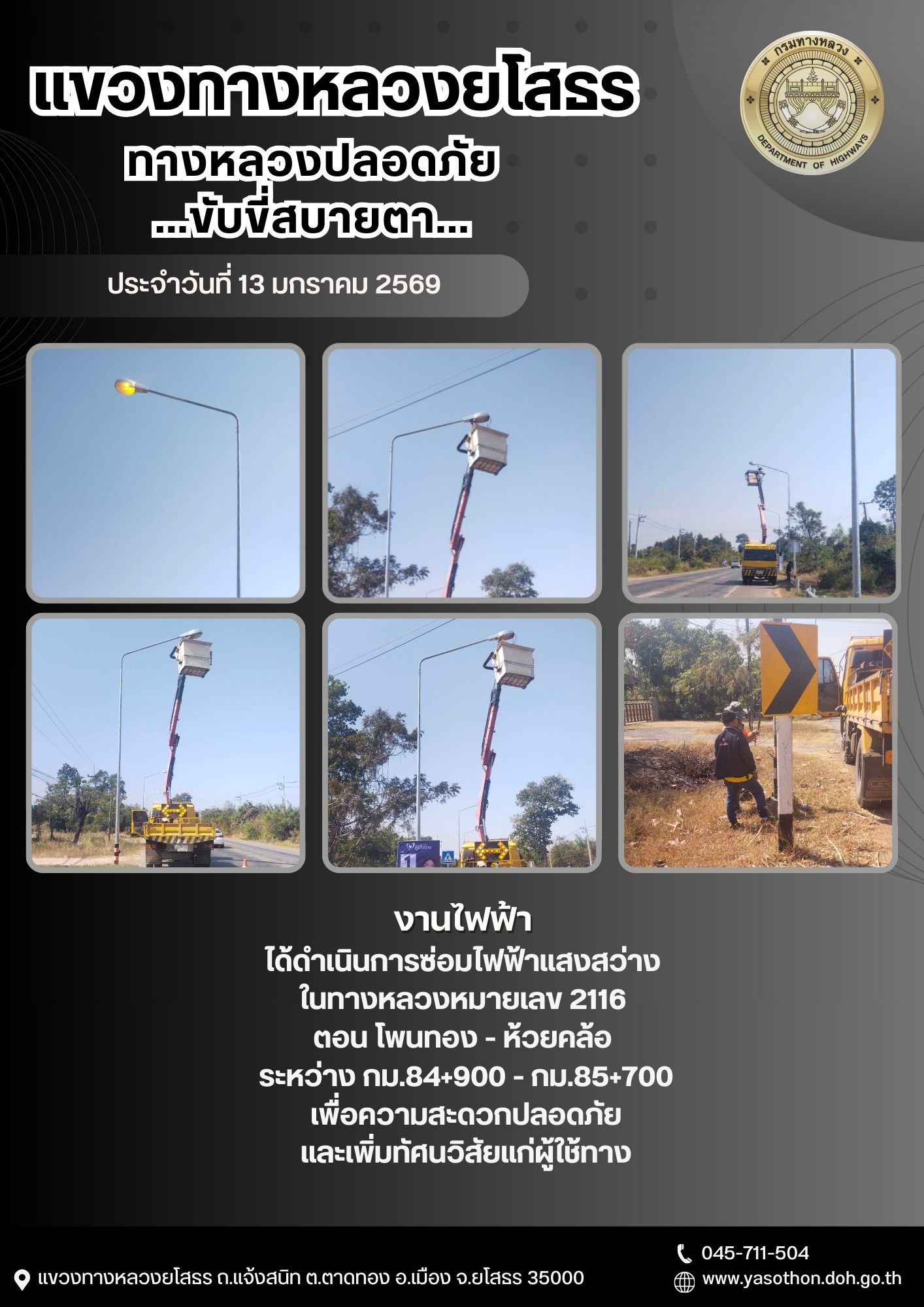 วันที่ 13 มกราคม 2569 งานไฟฟ้า ได้ดำเนินการซ่อมไฟฟ้าแสงสว่าง ในทางหลวงหมายเลข 2116 ตอน โพนทอง - ห้วยคล้อ ระหว่าง กม.84+900 - กม.85+700 เพื่อความสะดวกปลอดภัย และเพิ่มทัศนวิสัยแก่ผู้ใช้ทาง