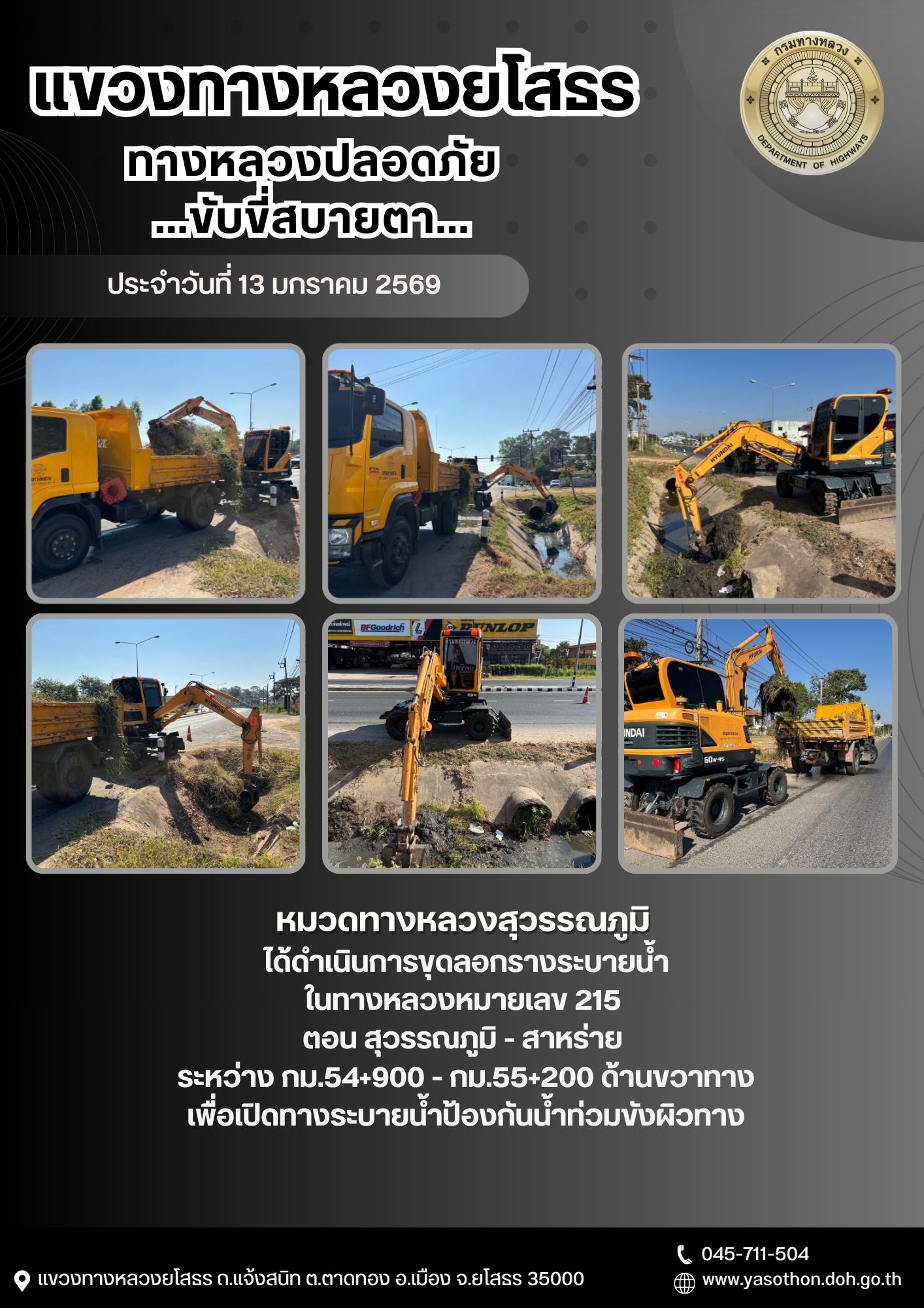 - [09:55] ทั่วไป วันพฤหัสบดีที่ 19 มีนาคม 2569 หมวดทางหลวงยโสธร ได้ดำเนินการทาสีราวกันอันตราย ในทางหลวงหมายเลข 292 ตอน ทางเลี่ยงเมืองยโสธร ระหว่าง กม.5+500 - กม.5+700 เพื่อความสะดวกปลอดภัย และเพิ่มทัศนวิสัยแก่ผู้ใช้ทาง