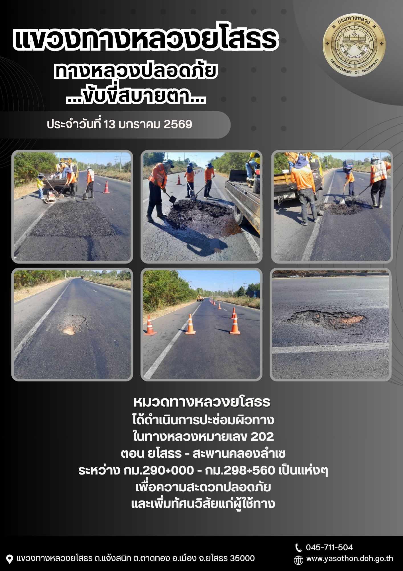 วันที่ 13 มกราคม 2569 หมวดทางหลวงยโสธร ได้ดำเนินการปะซ่อมผิวทาง ในทางหลวงหมายเลข 202 ตอน ยโสธร - สะพานคลองลำเซ ระหว่าง กม.290+000 - กม.298+560 เป็นแห่งๆ เพื่อความสะดวกปลอดภัย และเพิ่มทัศนวิสัยแก่ผู้ใช้ทาง