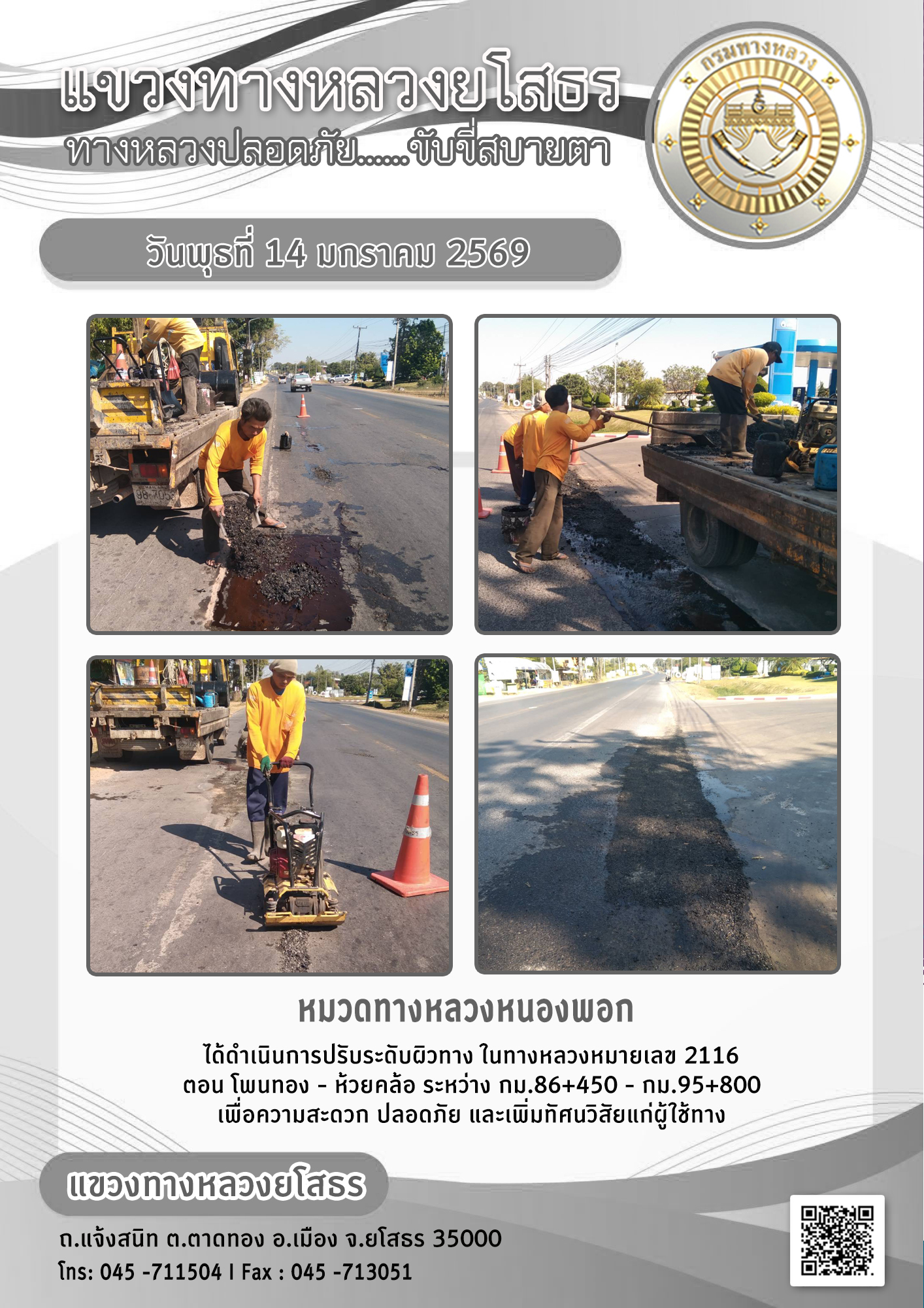 วันพุธที่ 14 มกราคม 2569 หมวดทางหลวงหนองพอก ได้ดำเนินการปรับระดับผิวทาง ในทางหลวงหมายเลข 2116 ตอน โพนทอง - ห้วยคล้อ ระหว่าง กม.86+450 - กม.95+800 เพื่อความสะดวก ปลอดภัย และเพิ่มทัศนวิสัยแก่ผู้ใช้ทาง