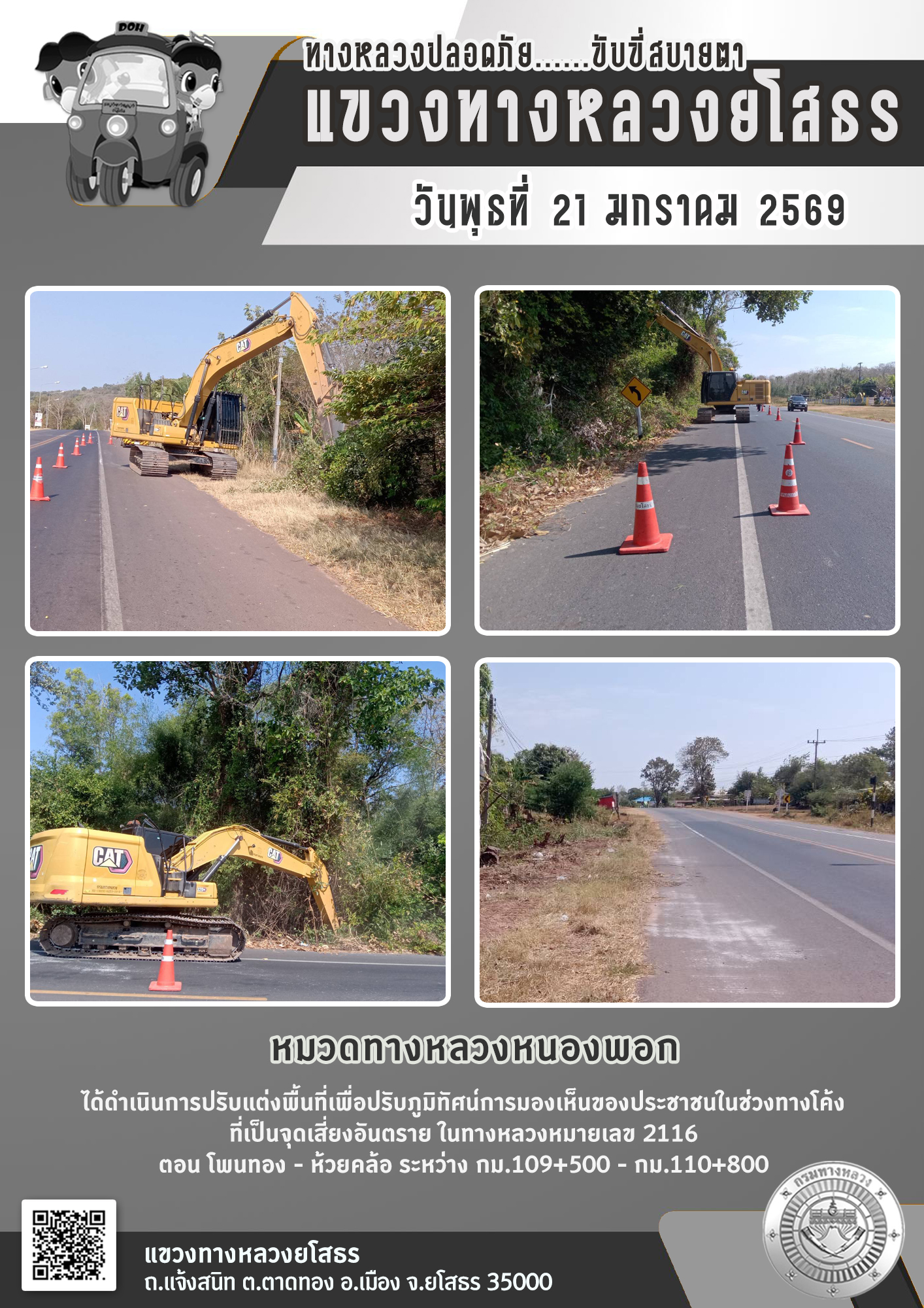 วันพุธที่ 21 มกราคม 2569 หมวดทางหลวงหนองพอก ได้ดำเนินการปรับแต่งพื้นที่เพื่อปรับภูมิทัศน์การมองเห็นของประชาชนในช่วงทางโค้ง ที่เป็นจุดเสี่ยงอันตราย ในทางหลวงหมายเลซ 2116 ตอน โพนทอง - ห้วยคล้อ ระหว่าง กม.109+500 - กม.110+800