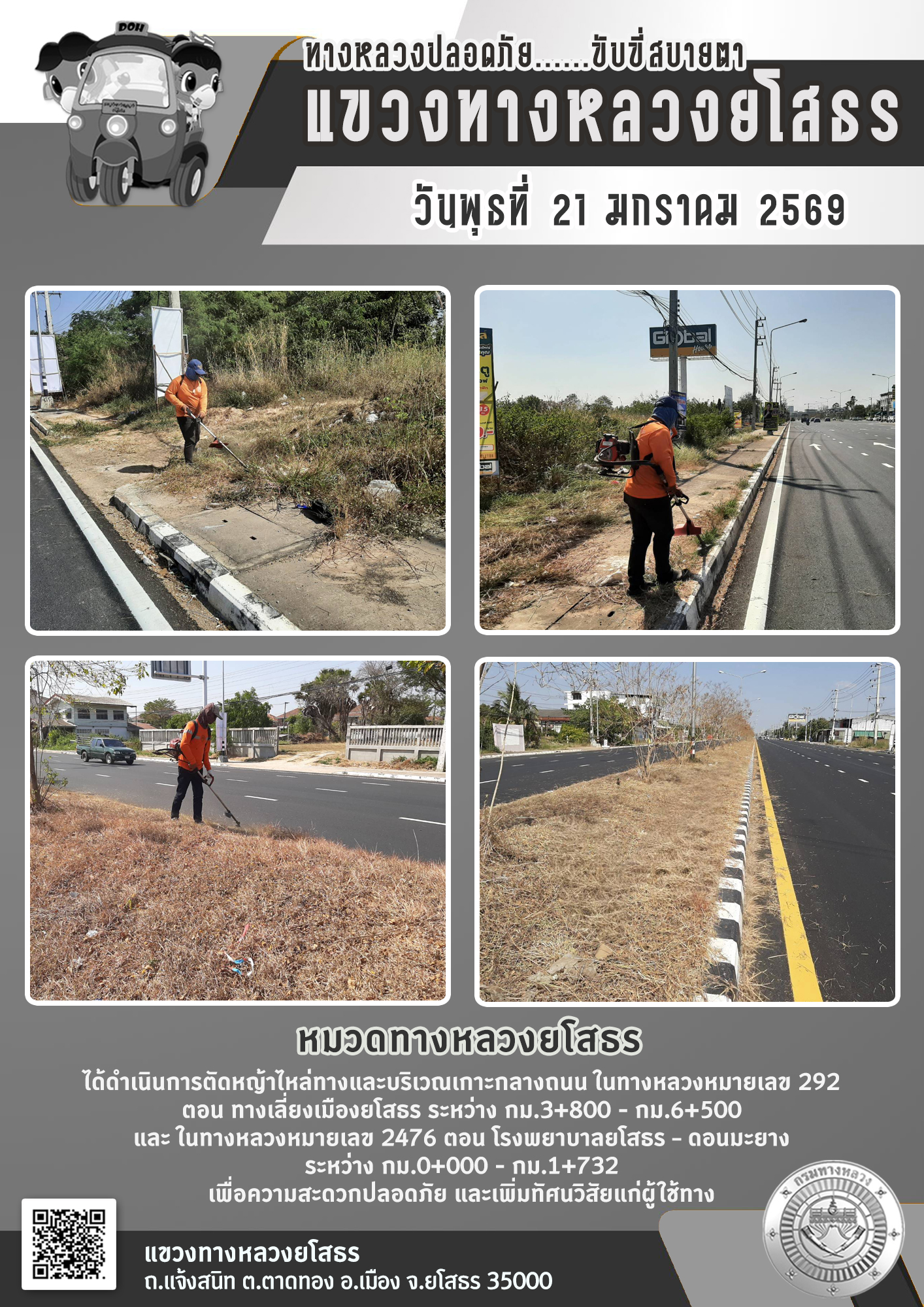 วันพุธที่ 21 มกราคม 2569 หมวดทางหลวงยโสธร ได้ดำเนินการตัดหญ้าไหล่ทางและบริเวณเกาะกลางถนน ในทางหลวงหมายเลข 292 ตอน ทางเลี่ยงเมืองยโสธร ระหว่าง กม.3+800 - กม.6+500 และในทางหลวงหมายเลข 2477 ตอน โรงพยาบาลยโสธร - ดอนมะยาง ระหว่าง กม.0+000 - กม.1+732 เพื่อ