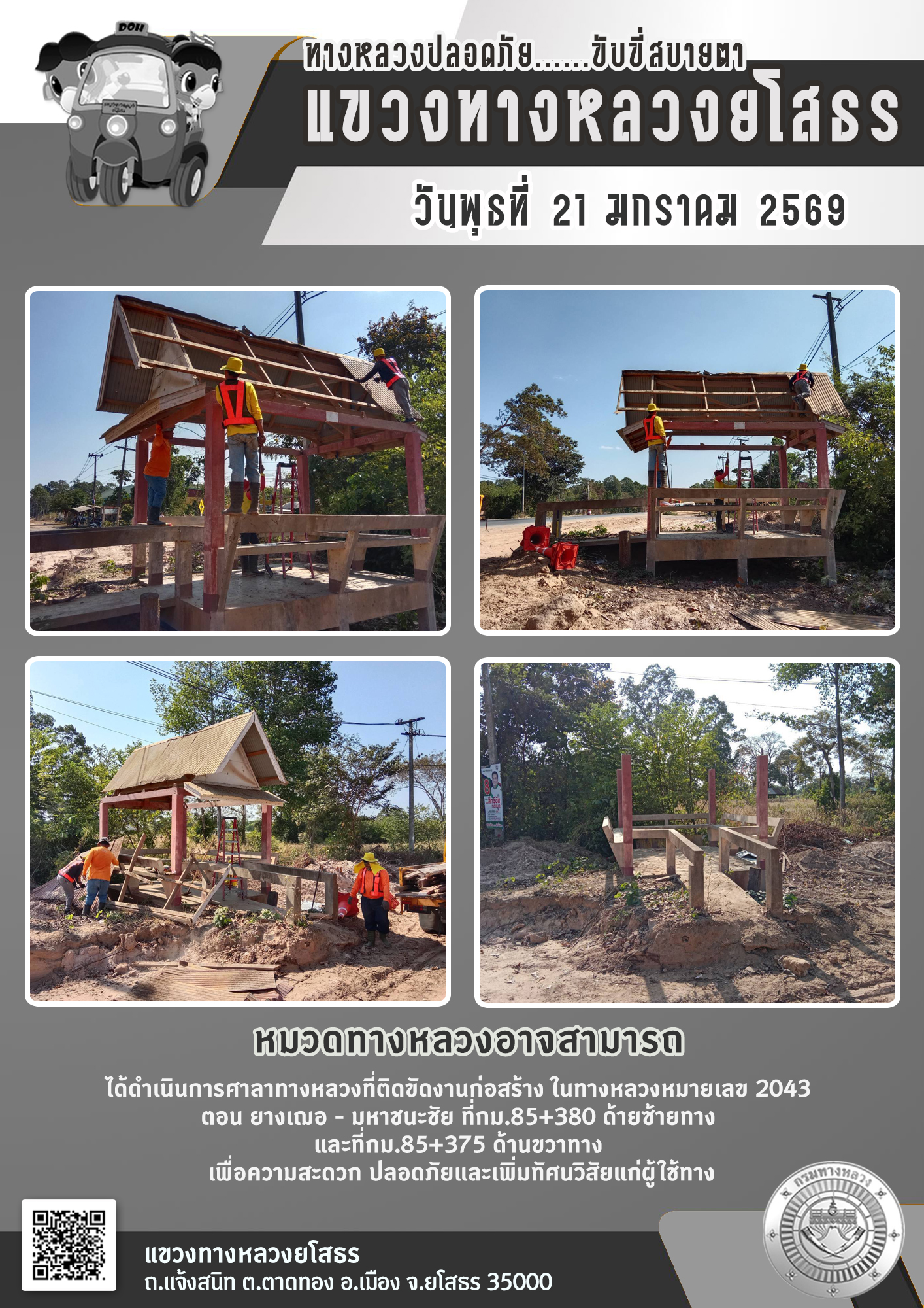 วันพุธที่ 21 มกราคม 2569 หมวดทางหลวงอาจสามารถ ได้ดำเนินการศาลาทางหลวงที่ติดขัดงานก่อสร้าง ในทางหลวงหมายเลข 2043 ตอน ยางเฌอ - มหาชนะชัย ที่ กม.85+380 ด้ายซ้ายทาง และ กม.85+375 ด้านขวาทาง เพื่อความสะดวก ปลอดภัยและเพิ่มทัศนวิสัยแก่ผู้ใช้ทาง